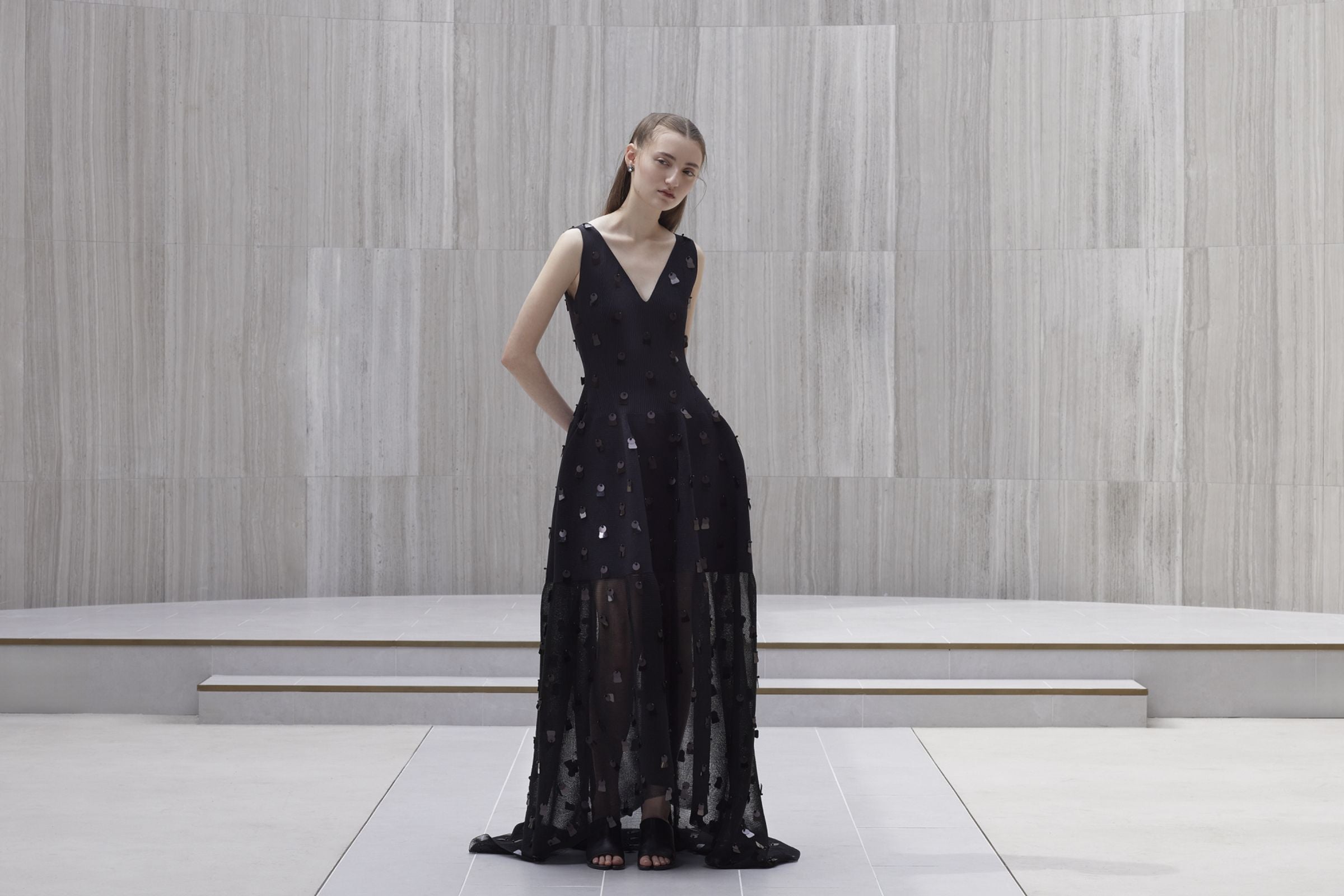 ブラックのドレスは、デコルテと背中が美しく映えるVラインのカットが特徴。形と質感が異なる2種類のスパンコールとビーズを組み合わせたパーツを全面に施し、ラグジュアリーな印象のドレスに仕上げました。