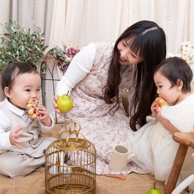 フォトブースを目の前にした我が子は不思議そうにしていましたが、時間とともに少しずつ慣れた様子。ブースにあったデコレーションアイテムがお気に入りでした。お座り前のお子様にはバンボの用意があります。