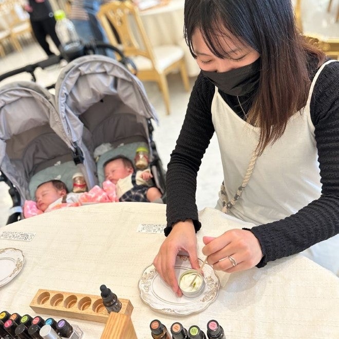 アロマのワークショップでは、産後ダイエットの悩みから、脂肪撃退・血行促進・ホルモンバランス・美肌効果などの効能をもつとされるアロマをブレンド。ワークショップ中は講師の先生に産後の悩みをお話しし、アロマの活用方法を教えてもらいました。