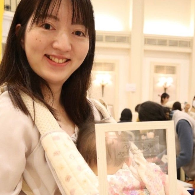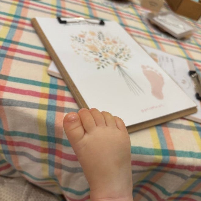 「足形フラワーワークショップ」では、インクで子どもの足形を取る「足形アート」も作成できました。産まれてからずっと取ろうと思っていた足形ですが、結局自宅ではできずじまいだったので、よい機会になりました。