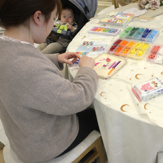 お気に入りの色を子どもの名前のアルファベット型に詰めこむと、カラフルなオリジナルクレヨンが完成!色が混ざり合う様子は、はじめてのアート体験にもなります。