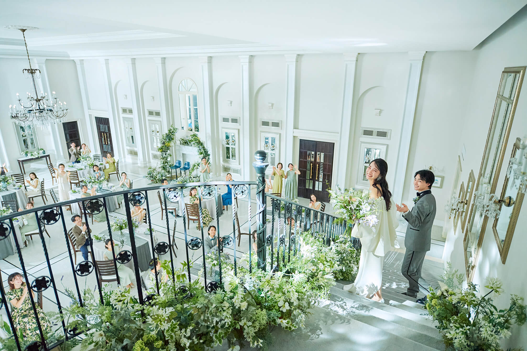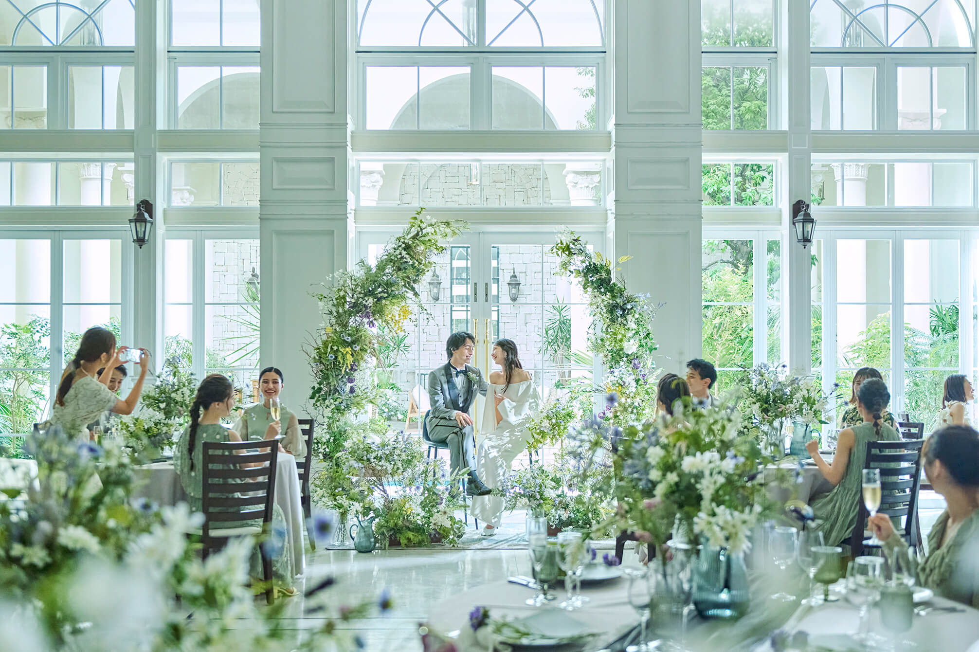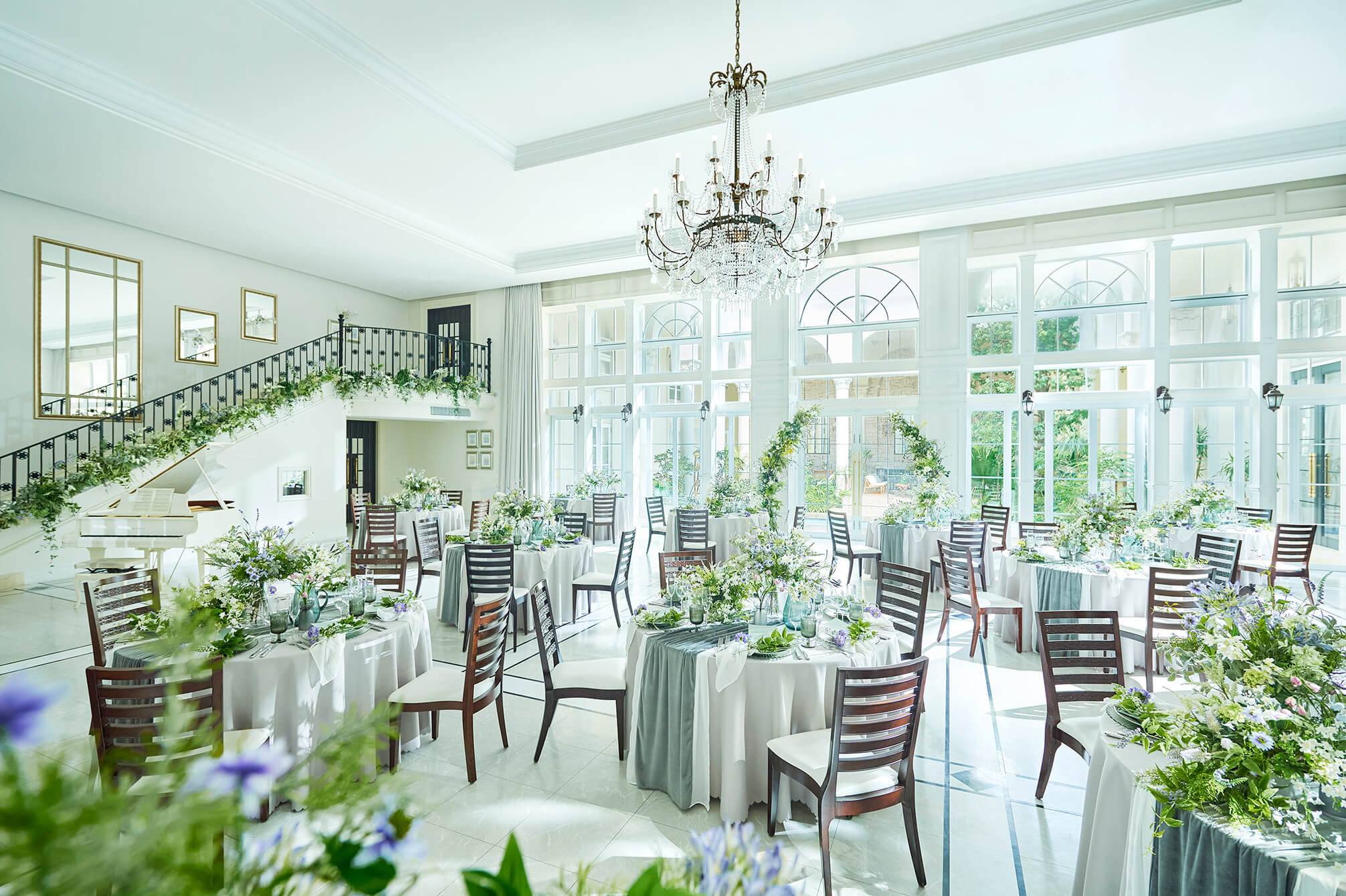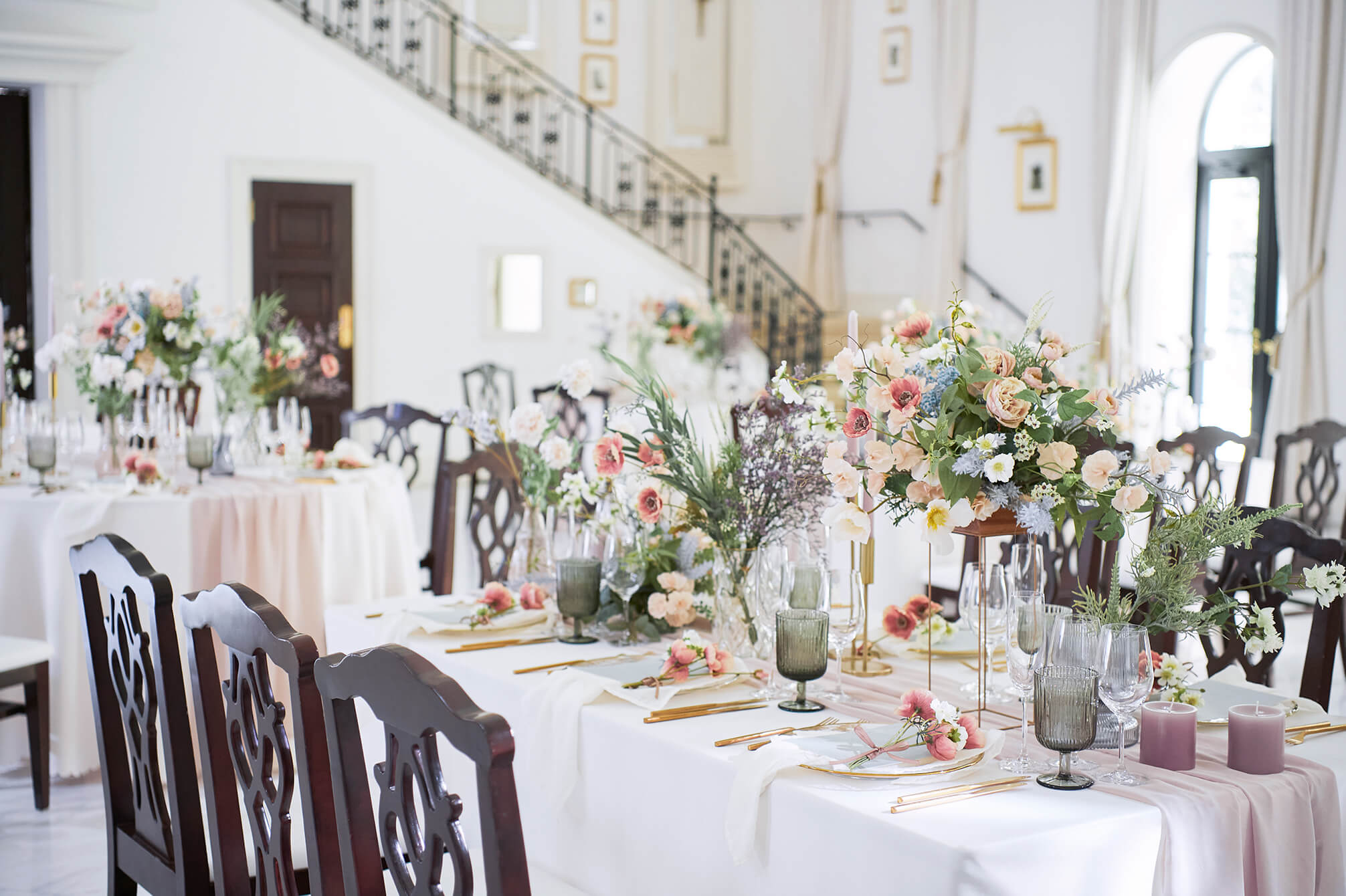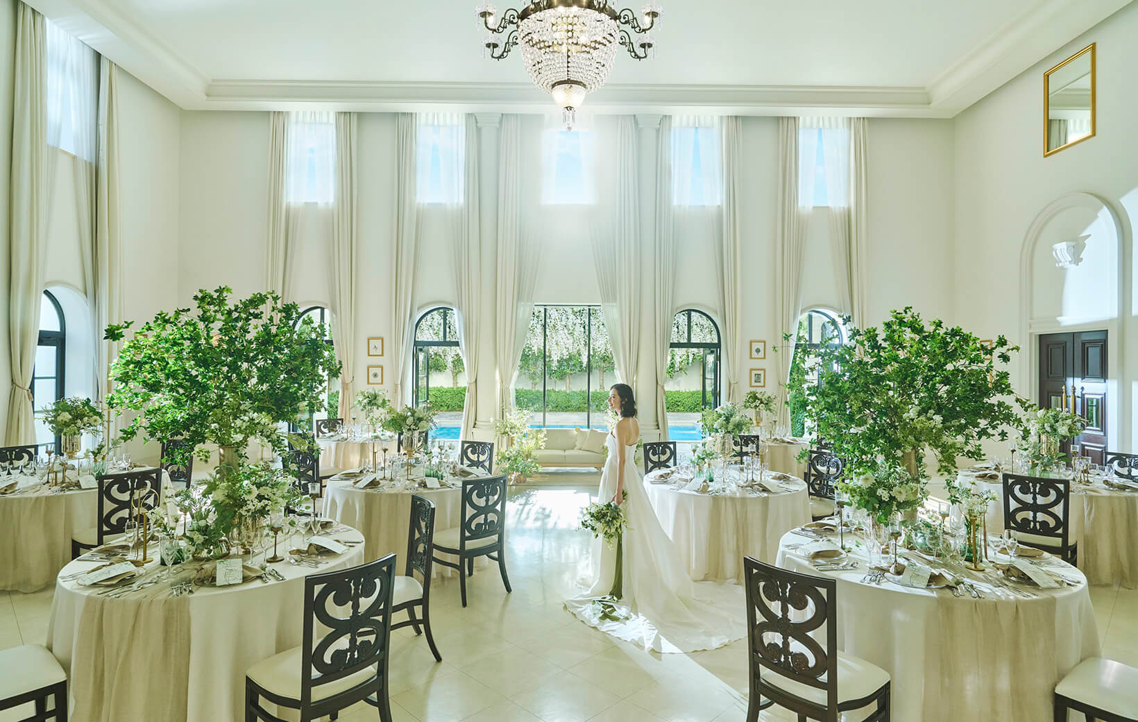 「ホワイトハウス」「ヴィクトリアハウス」のそれぞれの邸宅内の、貸切パーティ空間。白基調の会場を、おふたりのウェディングコンセプトをイメージしたフラワーコーディネートで彩ります。プール付のプライベートガーデンや、チャペル、ロビー・控室も同じ邸宅内に併設しているので、ひとつの空間でゲストと一緒に愉しめるのは、完全貸切ゲストハウスならでは。