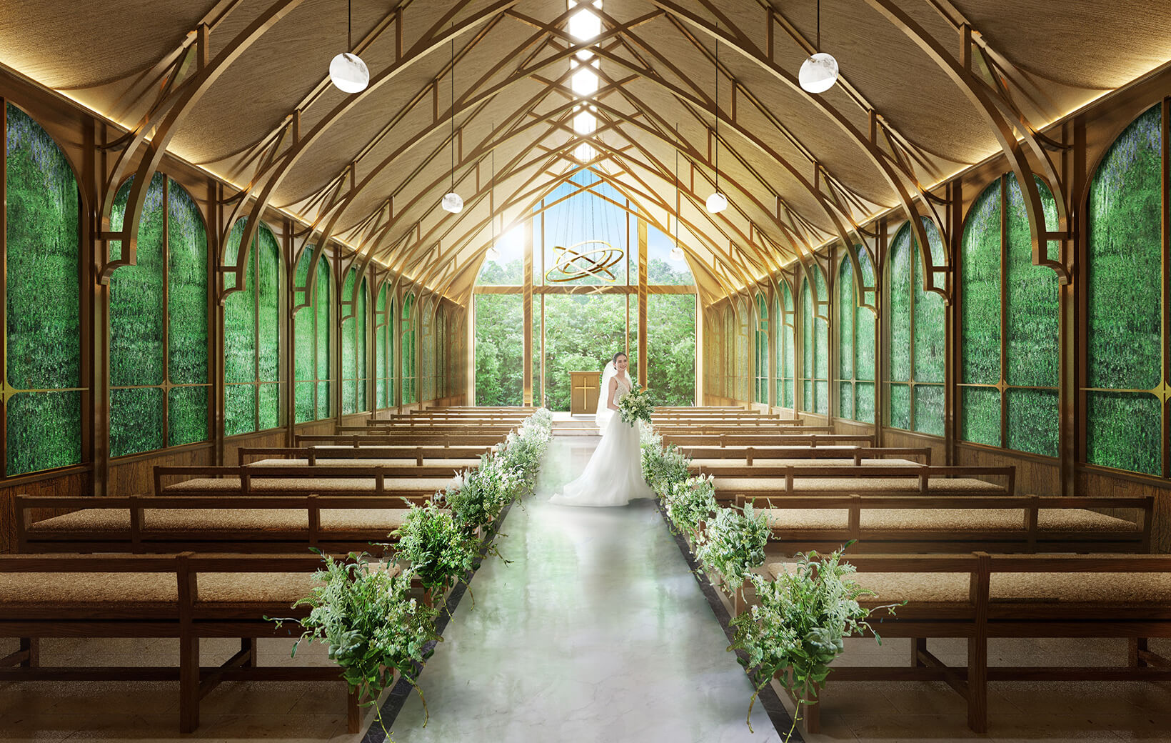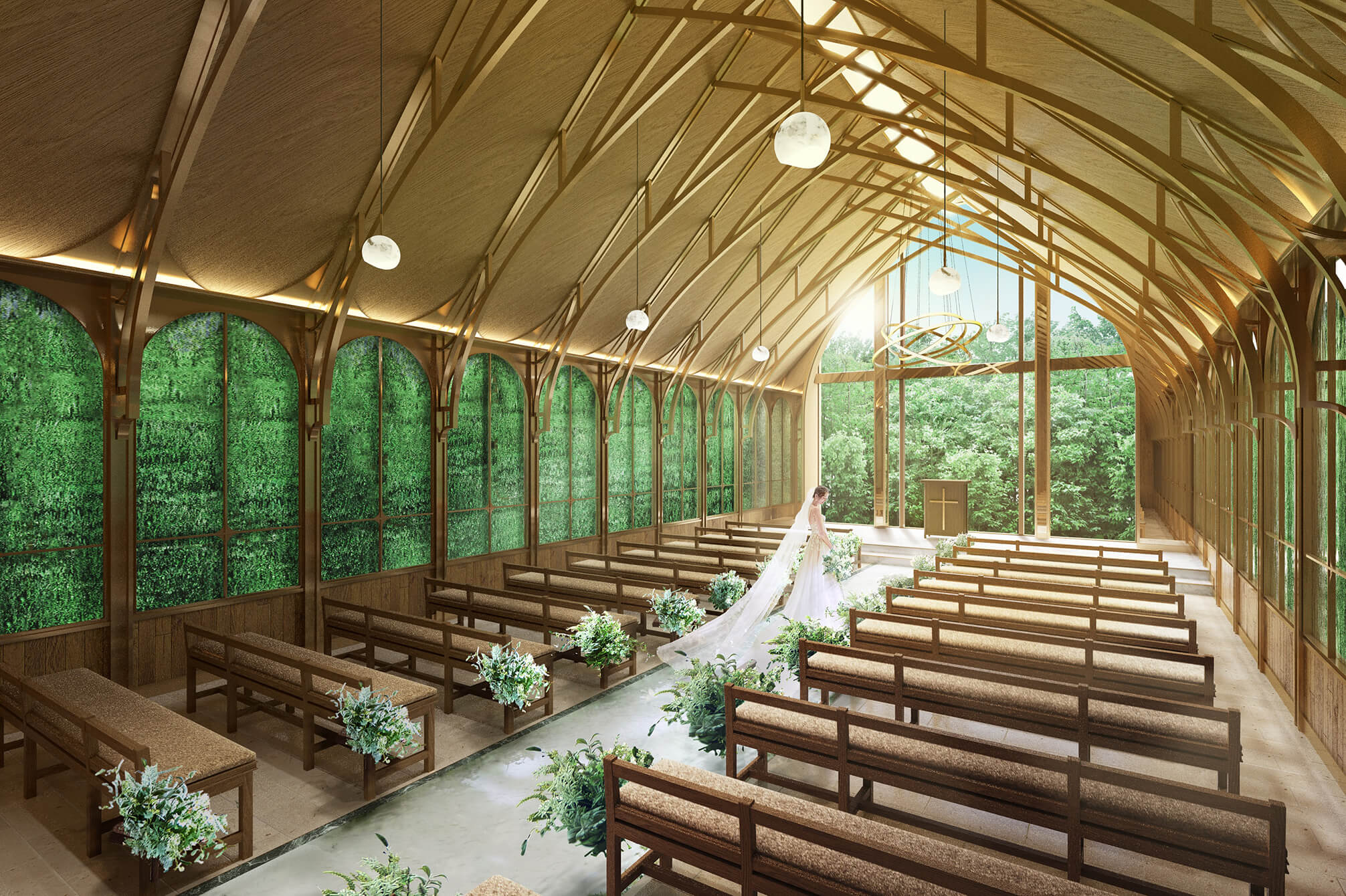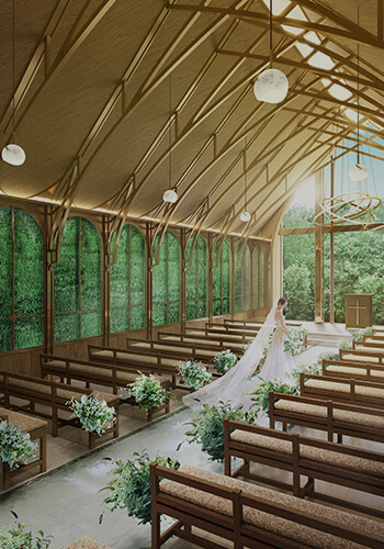 神聖な森の中に佇むようなアーチ状デザインのウッド調チャペル