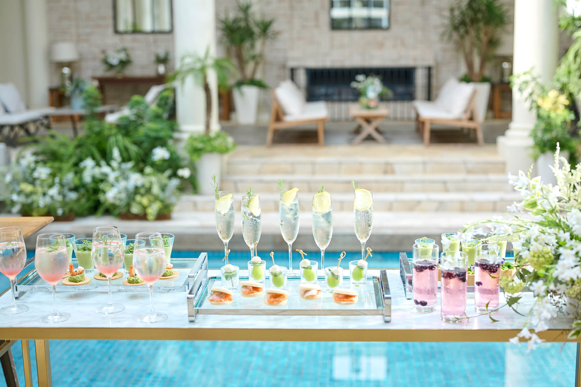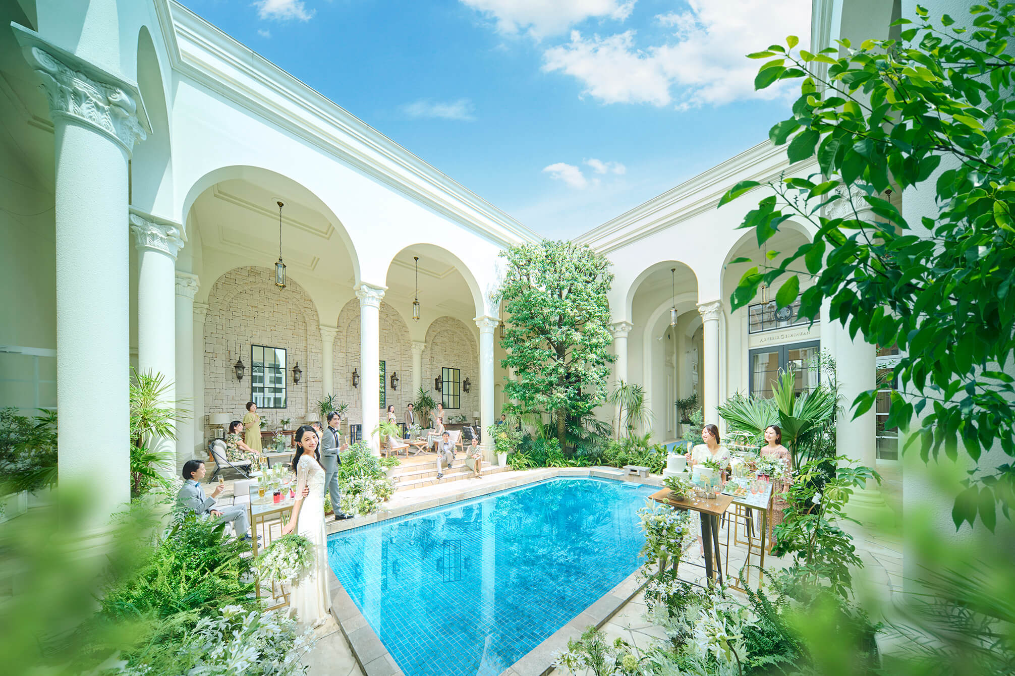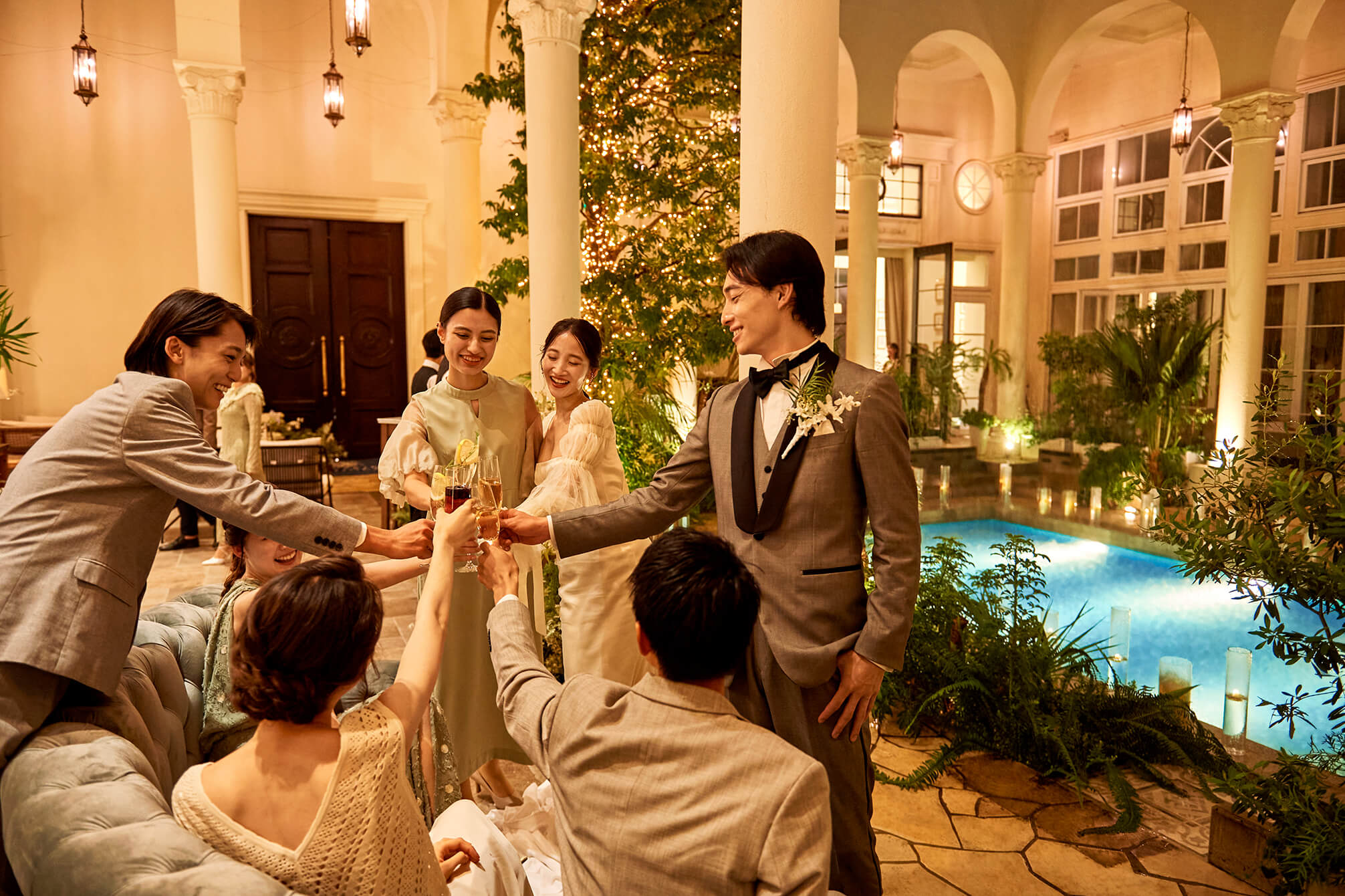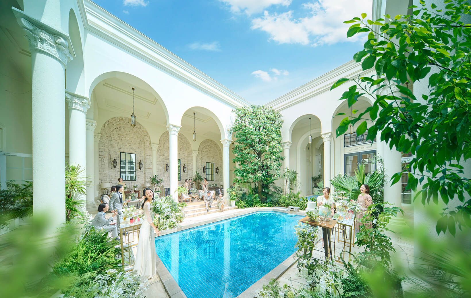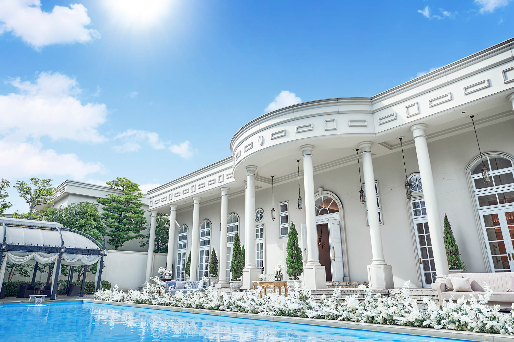 披露宴会場に隣接するプール付きの中庭も完全貸切。青空の下、心地よい風を感じながら、開放的な雰囲気で過ごせるプライベートガーデン。パーティの途中にガーデンでの乾杯や、デザートブッフェの演出はゲストにも人気。