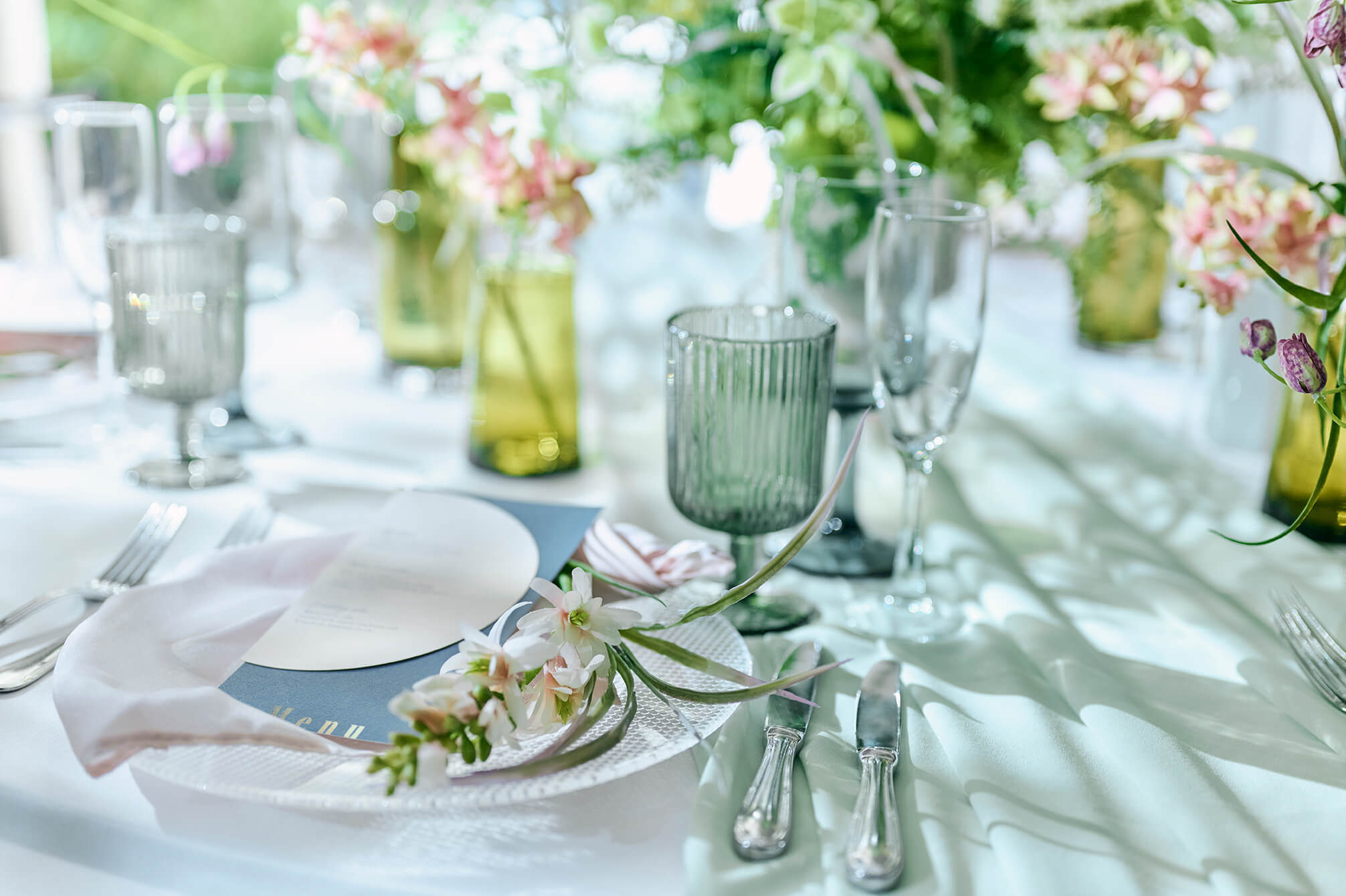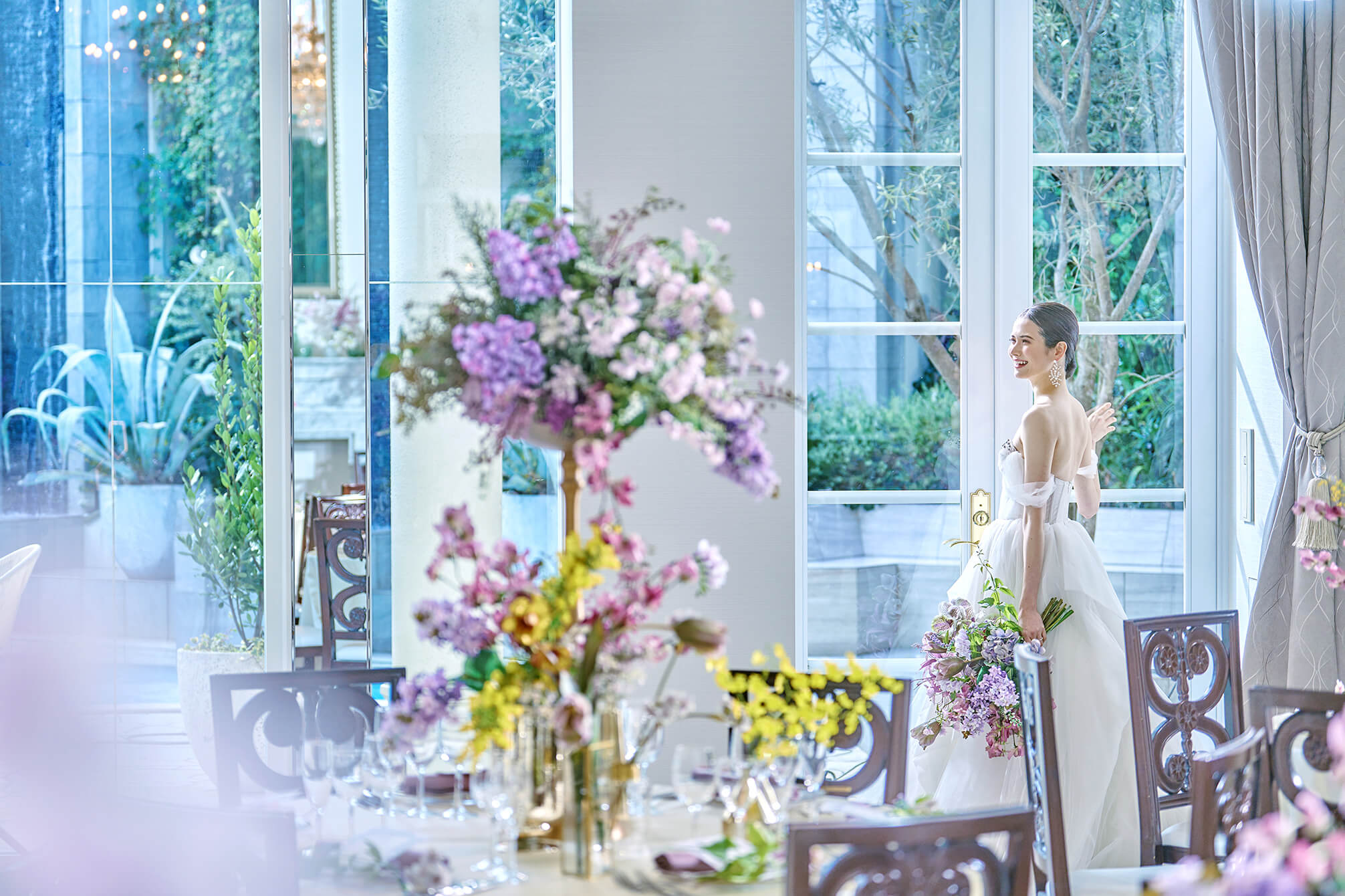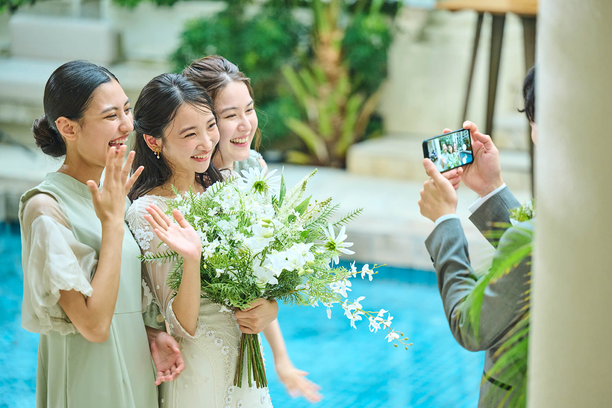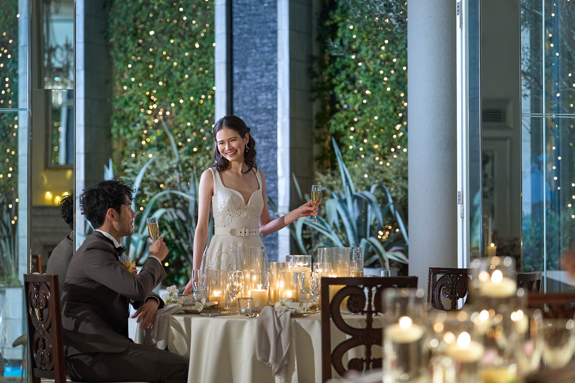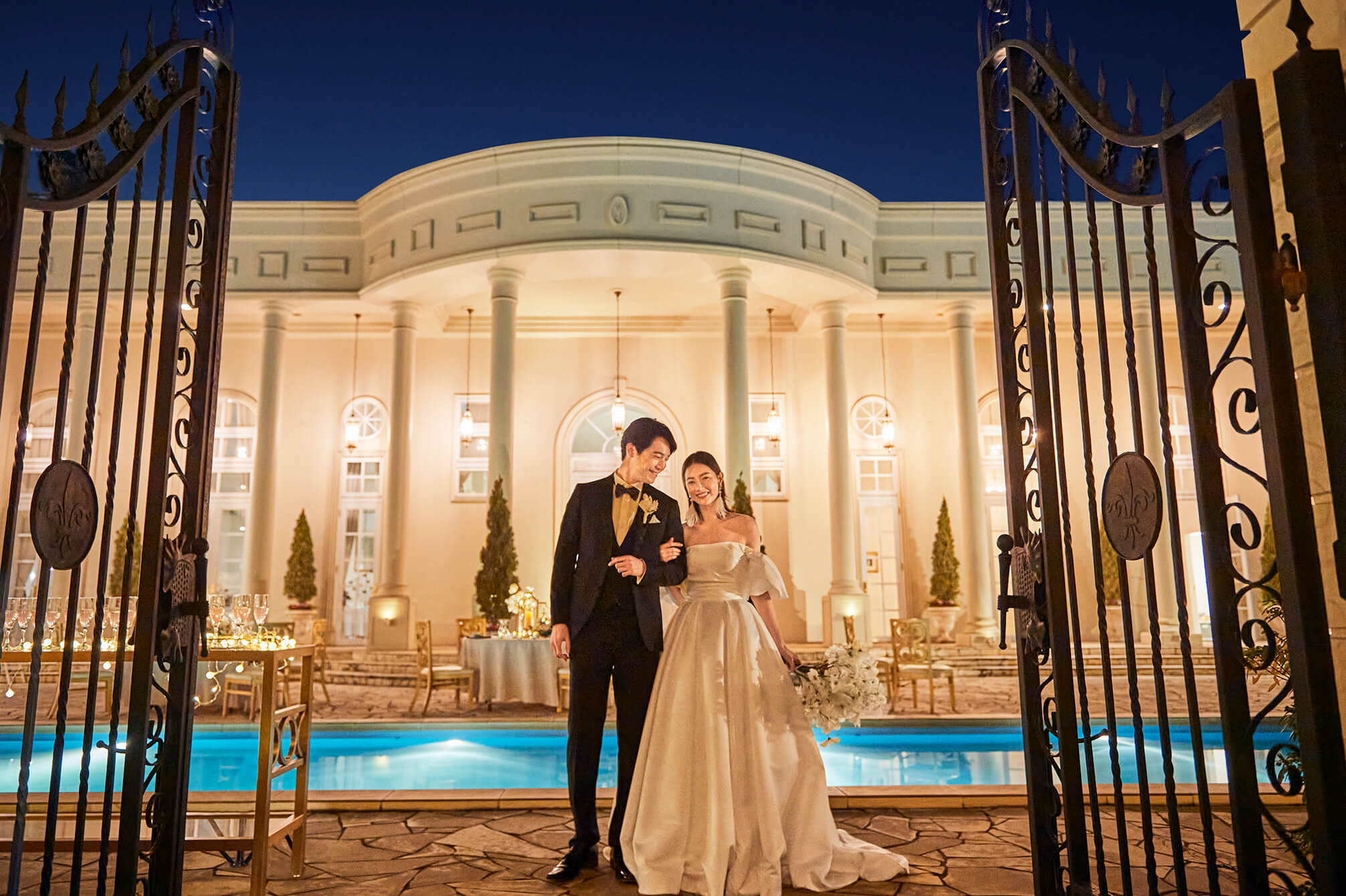 披露宴会場に隣接するプール付きの中庭も完全貸切。青空の下、心地よい風を感じながら、開放的な雰囲気で過ごせるプライベートガーデン。パーティの途中にガーデンでの乾杯や、デザートブッフェの演出はゲストにも人気。