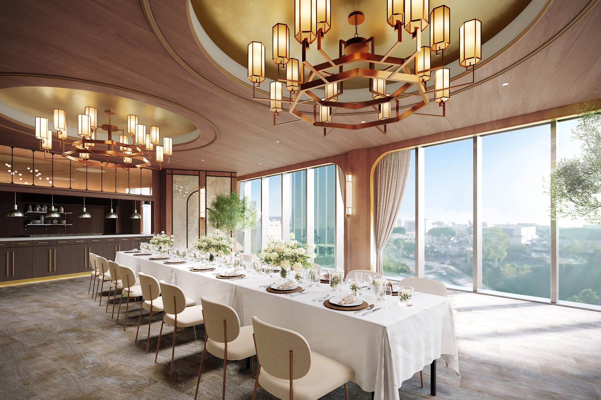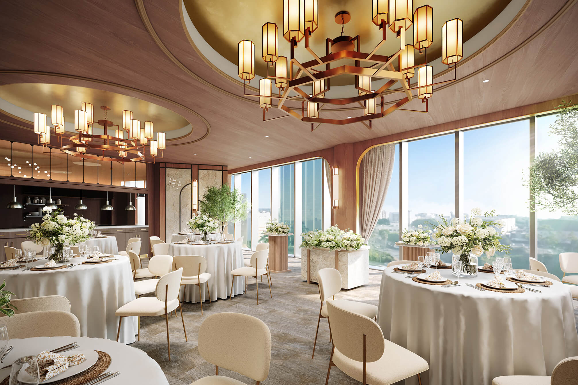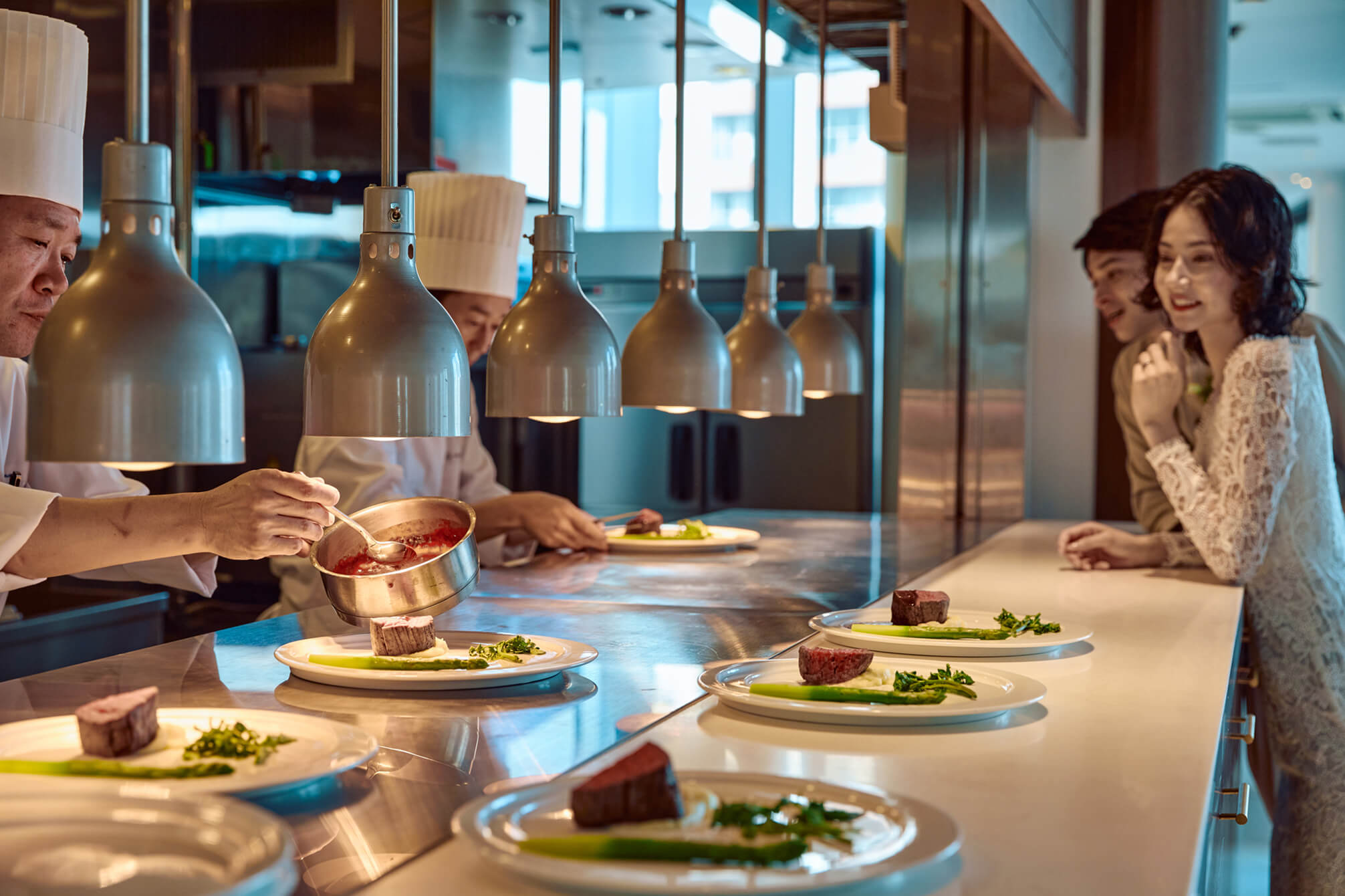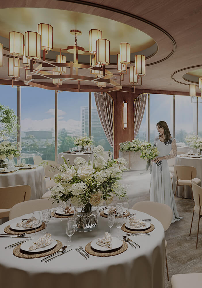 11階の披露宴会場がリニューアル。トレンド感のあるゴールドのシャンデリアと、落ち着きのあるブラウンを基調とした、上質さにこだわった空間です。一面に広がるのは、大阪のシティビュー。隣接するテラスガーデンの緑と、窓から差し込む自然光が、空間全体を華美すぎず抜け感のある雰囲気に。オープンキッチンから提供する出来立てのフルコースで、ゲストをおもてなし。
