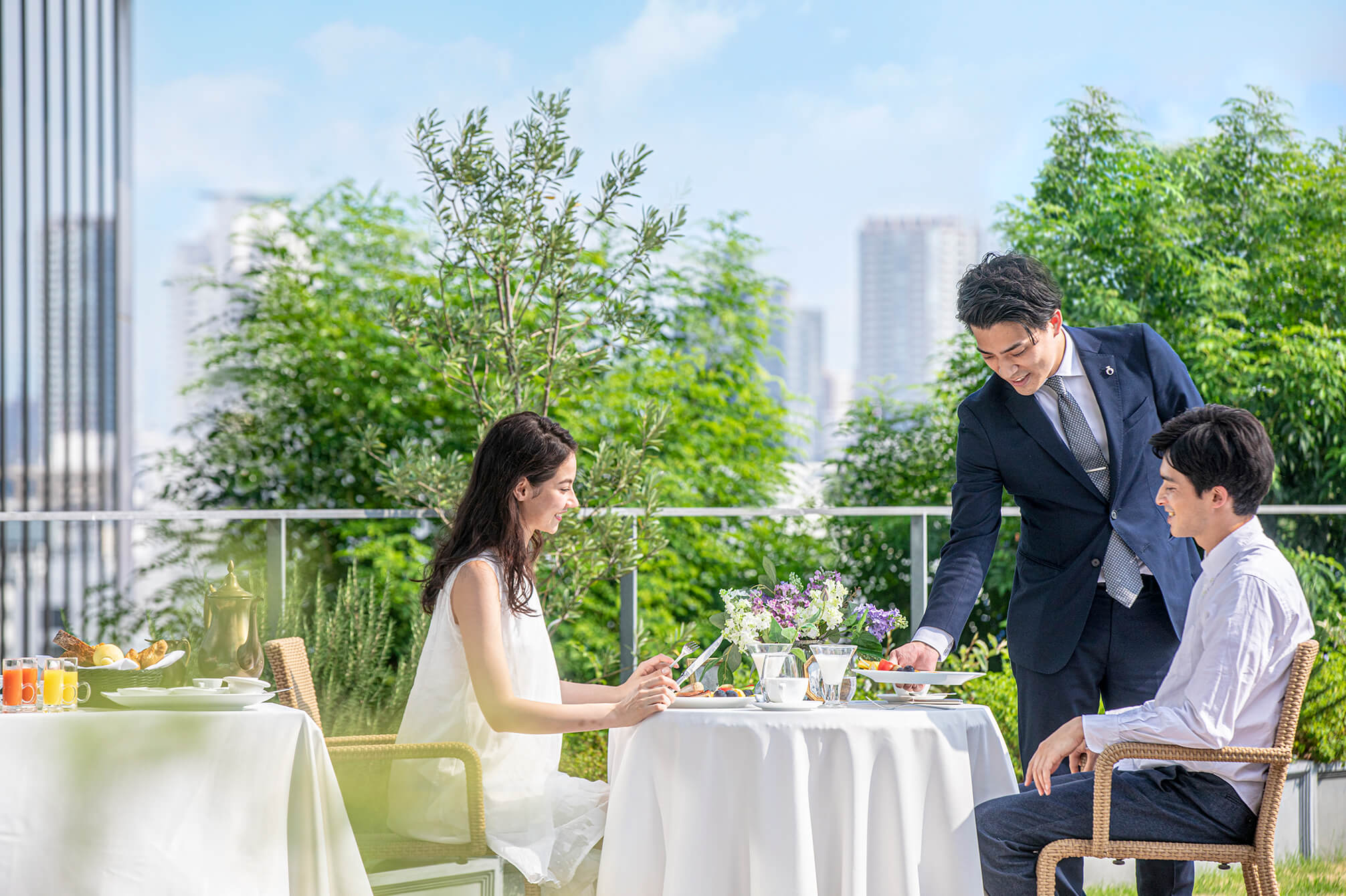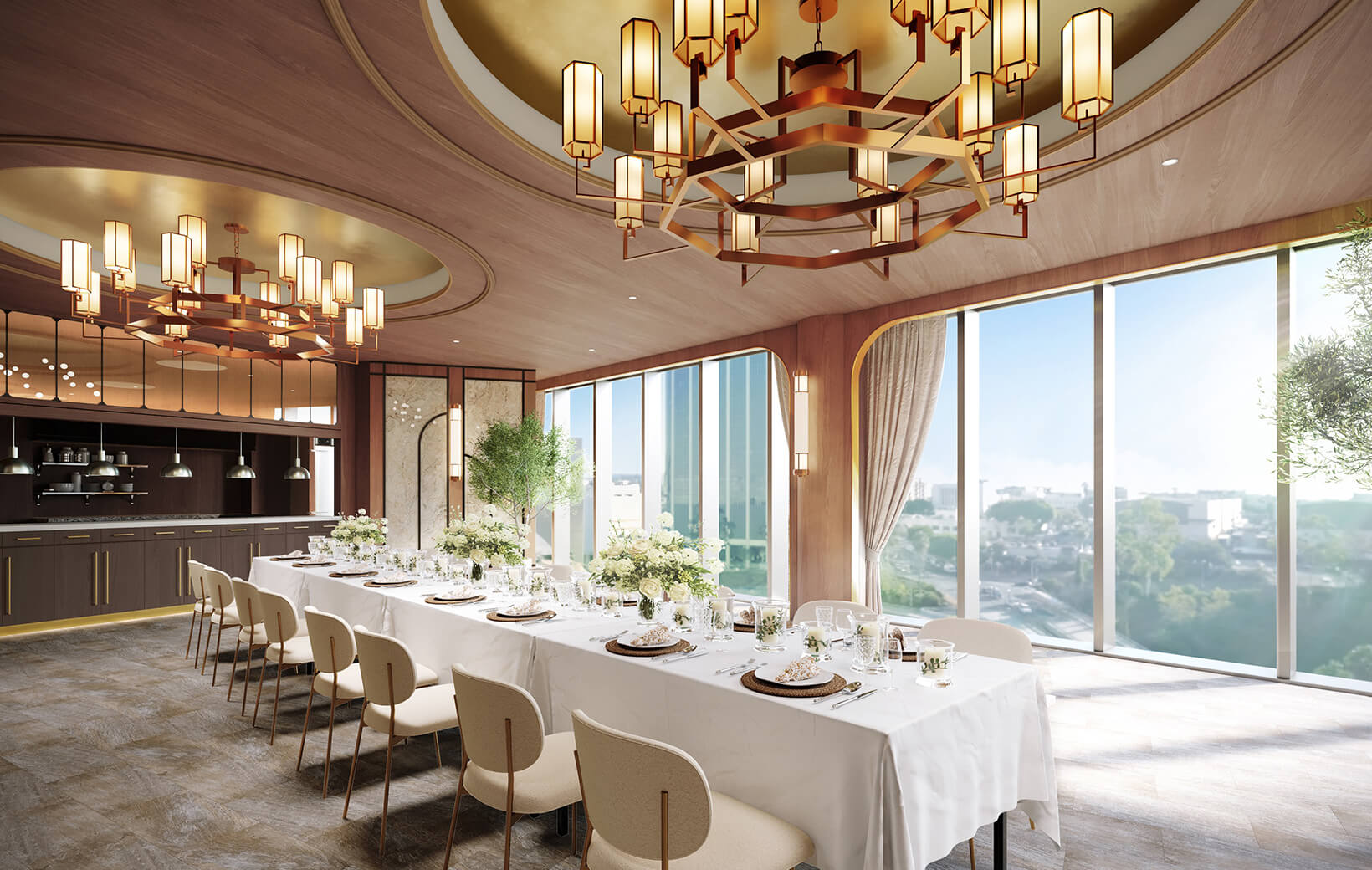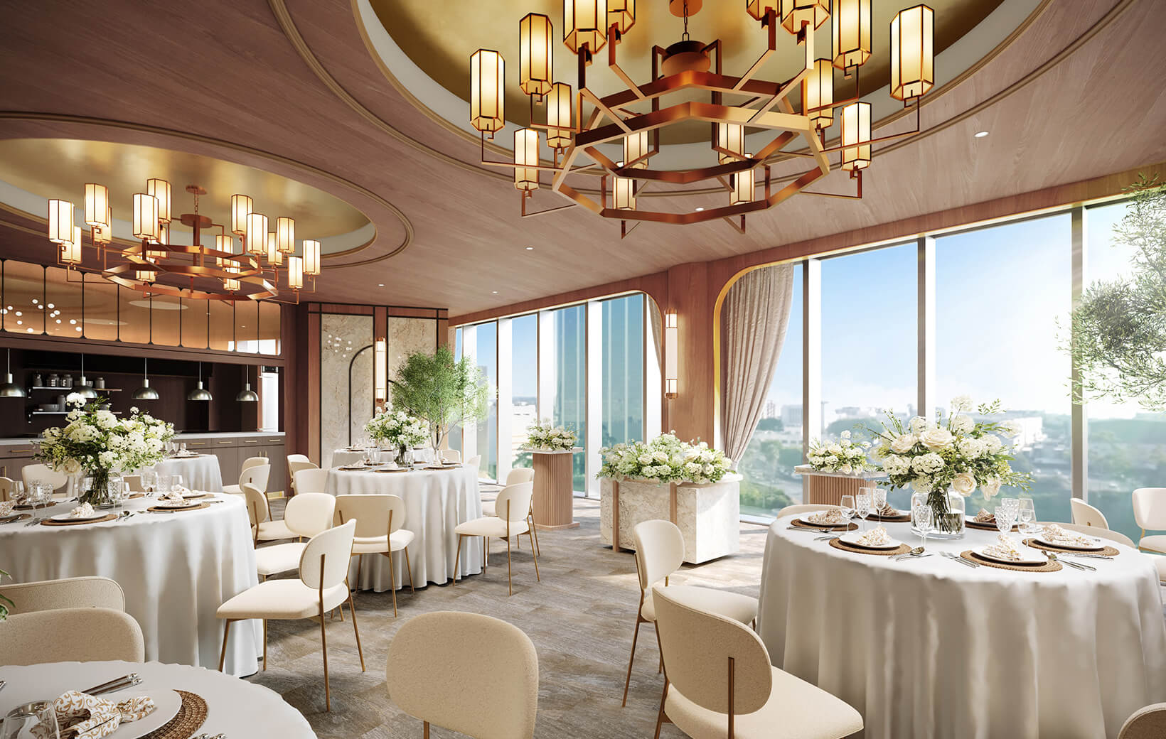 11階の披露宴会場がリニューアル。トレンド感のあるゴールドのシャンデリアと、落ち着きのあるブラウンを基調とした、上質さにこだわった空間です。一面に広がるのは、大阪のシティビュー。隣接するテラスガーデンの緑と、窓から差し込む自然光が、空間全体を華美すぎず抜け感のある雰囲気に。オープンキッチンから提供する出来立てのフルコースで、ゲストをおもてなし。