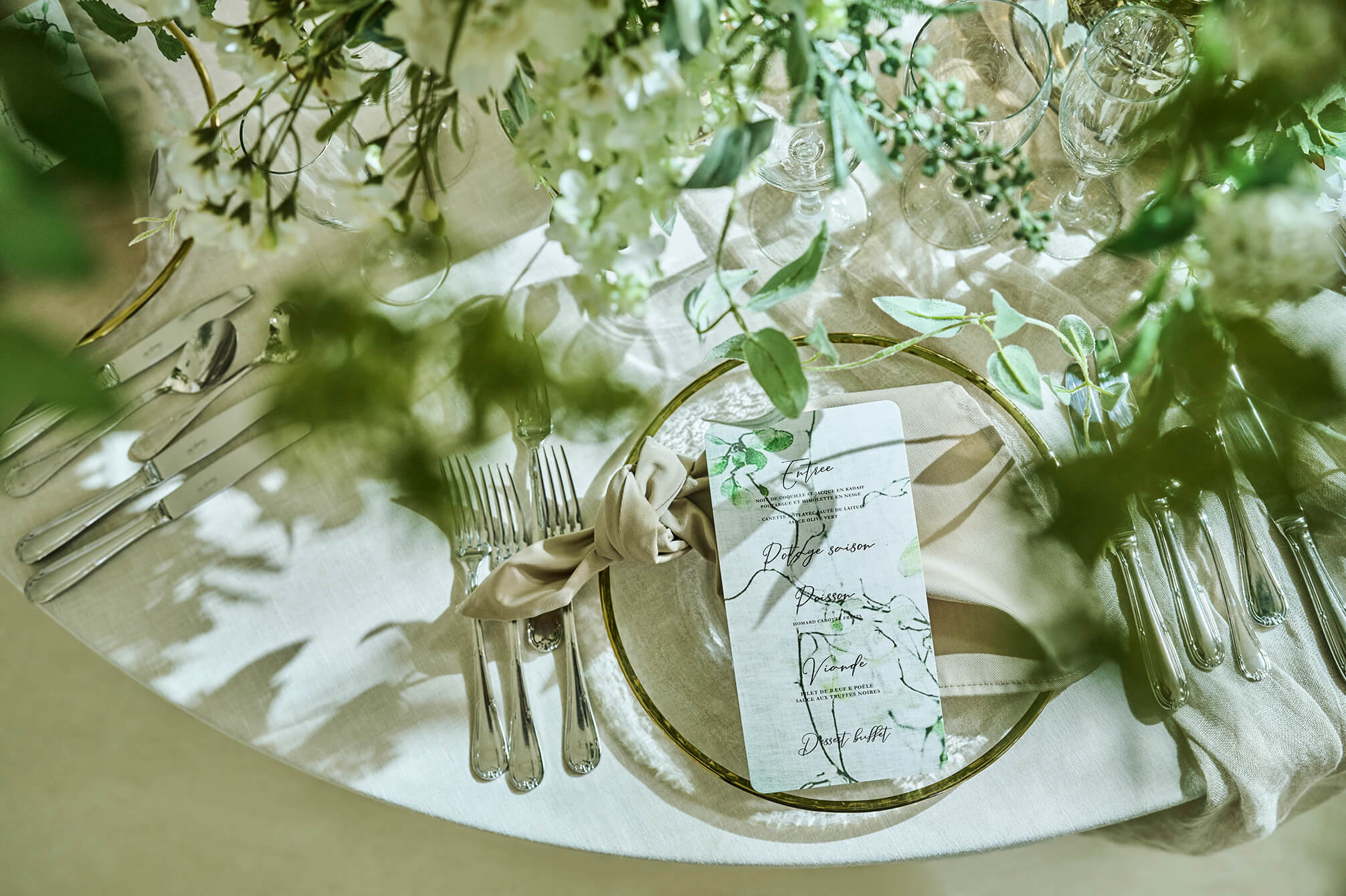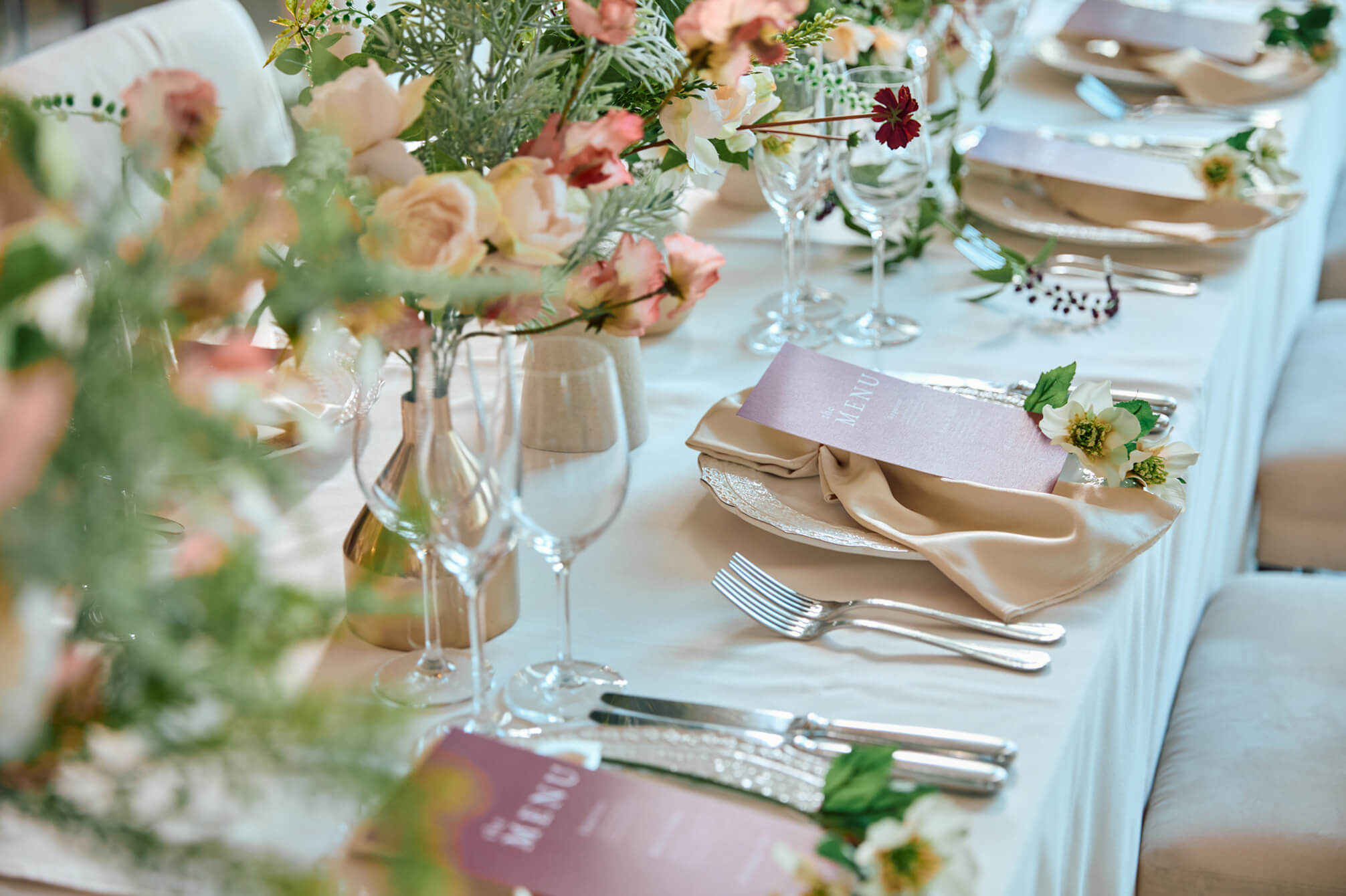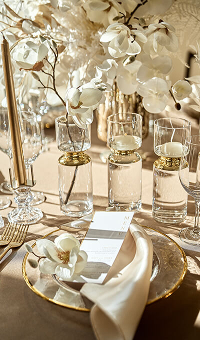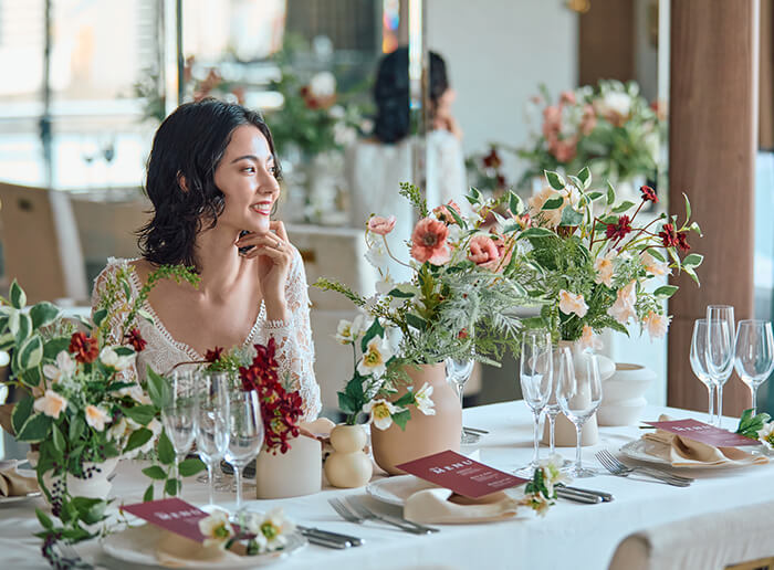 新しい披露宴会場では、10~30名様の少人数ウェディングにおすすめなテーブルのセッティングをご用意。おふたりとゲストひとりひとりが、近い距離で会話と食事を愉しめる空間です。少人数ウェディング専用のお得なプランもご用意しています。