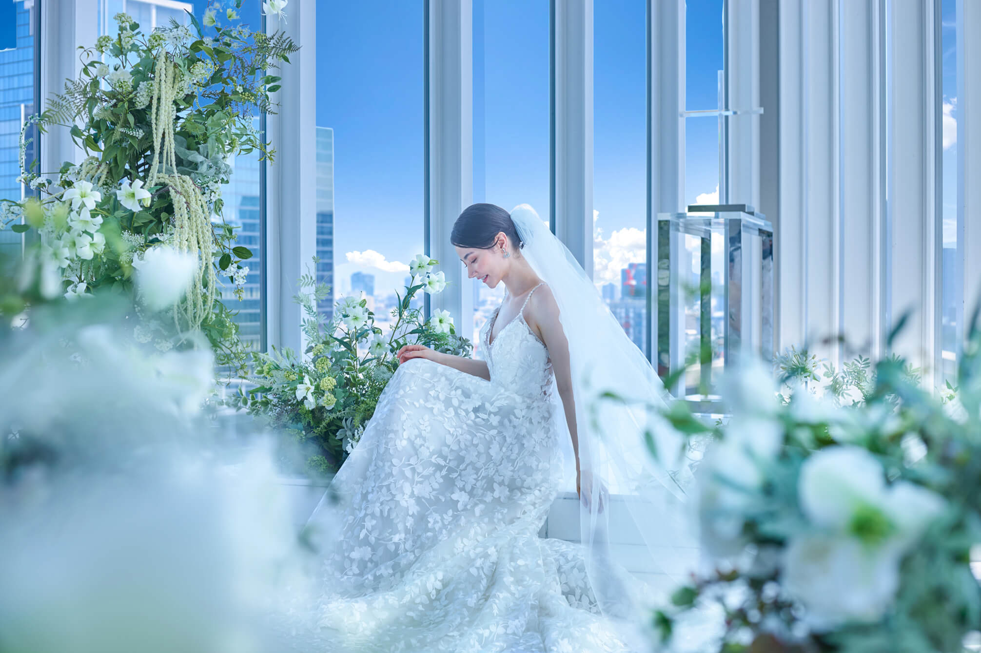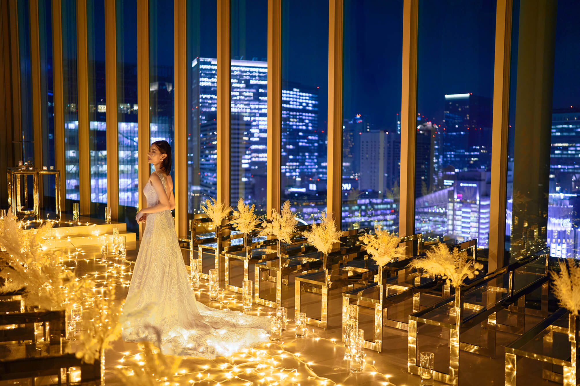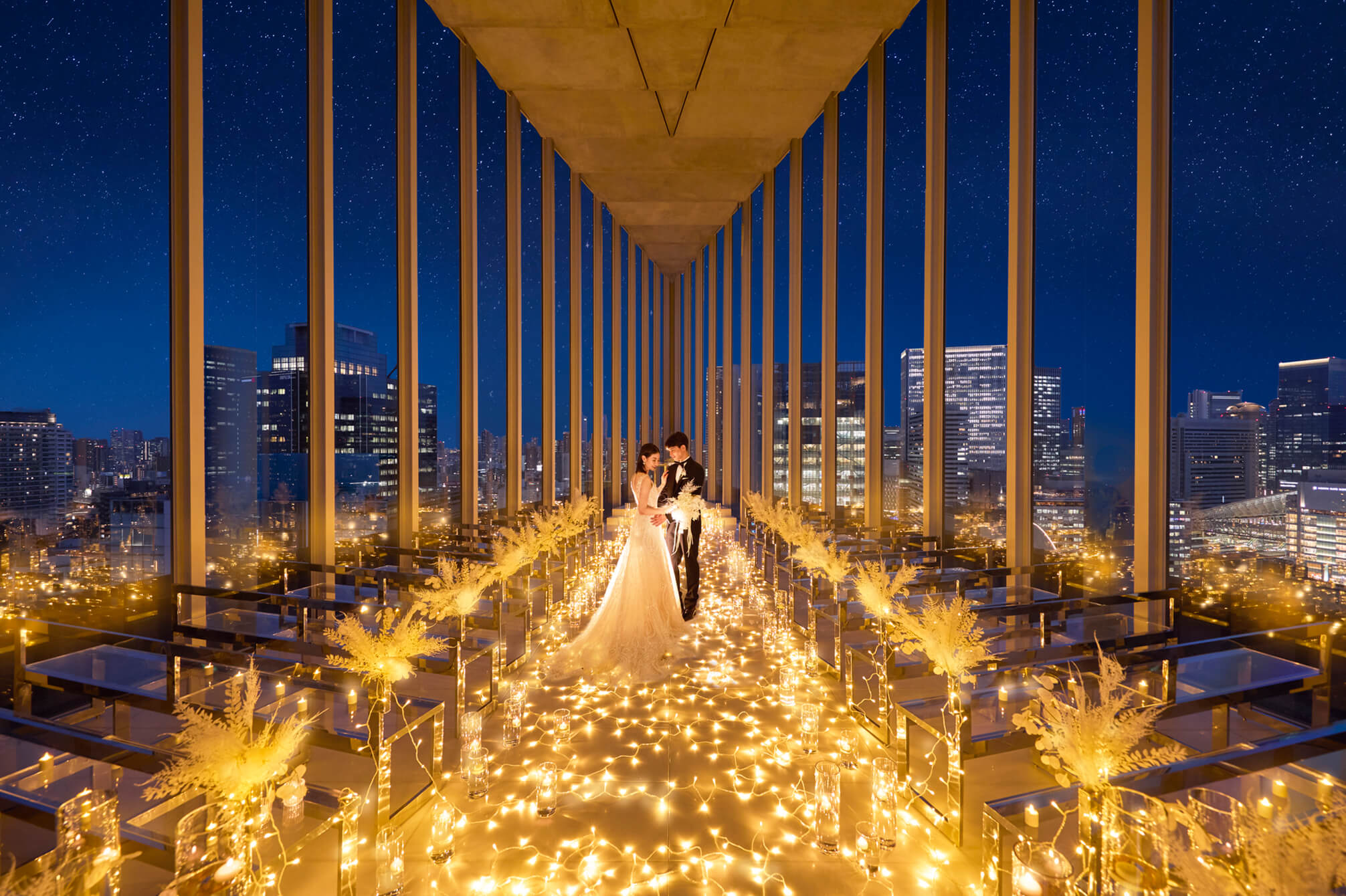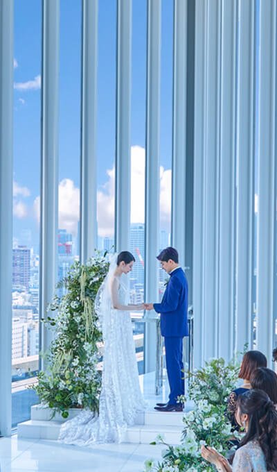 安藤忠雄建築研究所が手掛けた”天空のチャペル”。無駄なものを削ぎ落とした、都会的で洗練された建築デザインです。ホテルの最上階、全面の窓からは美しいシティビューと青空が広がります。ナイトタイムの夜景の中でのウェディングフォトも人気です。