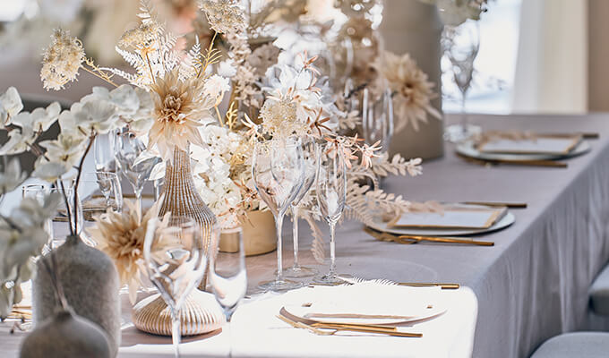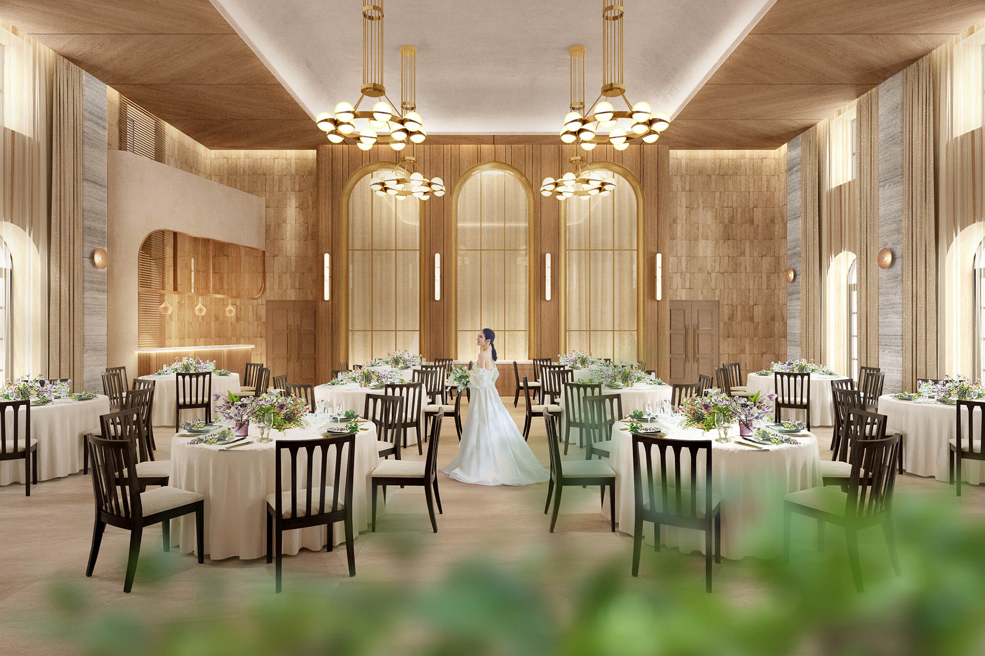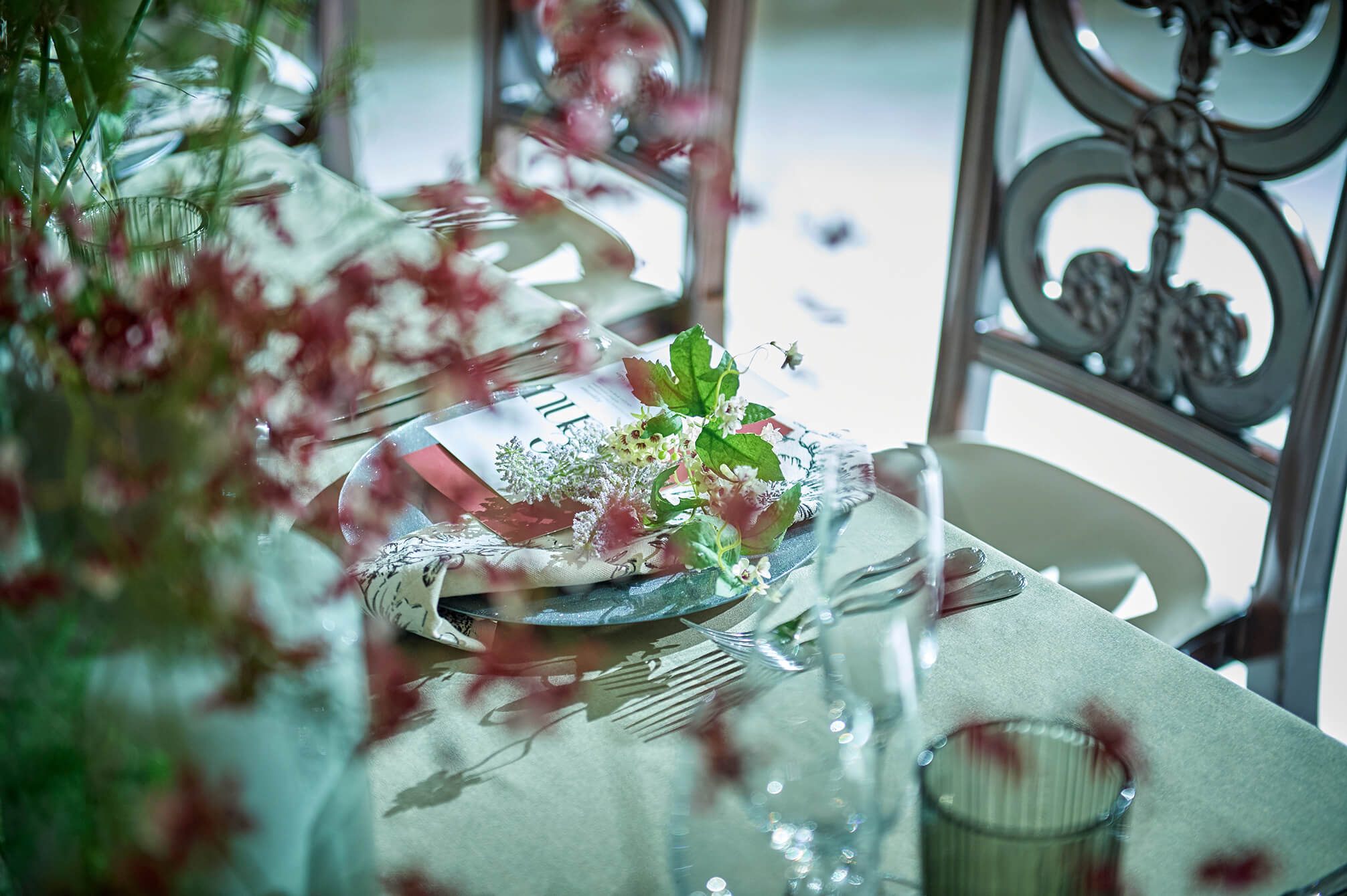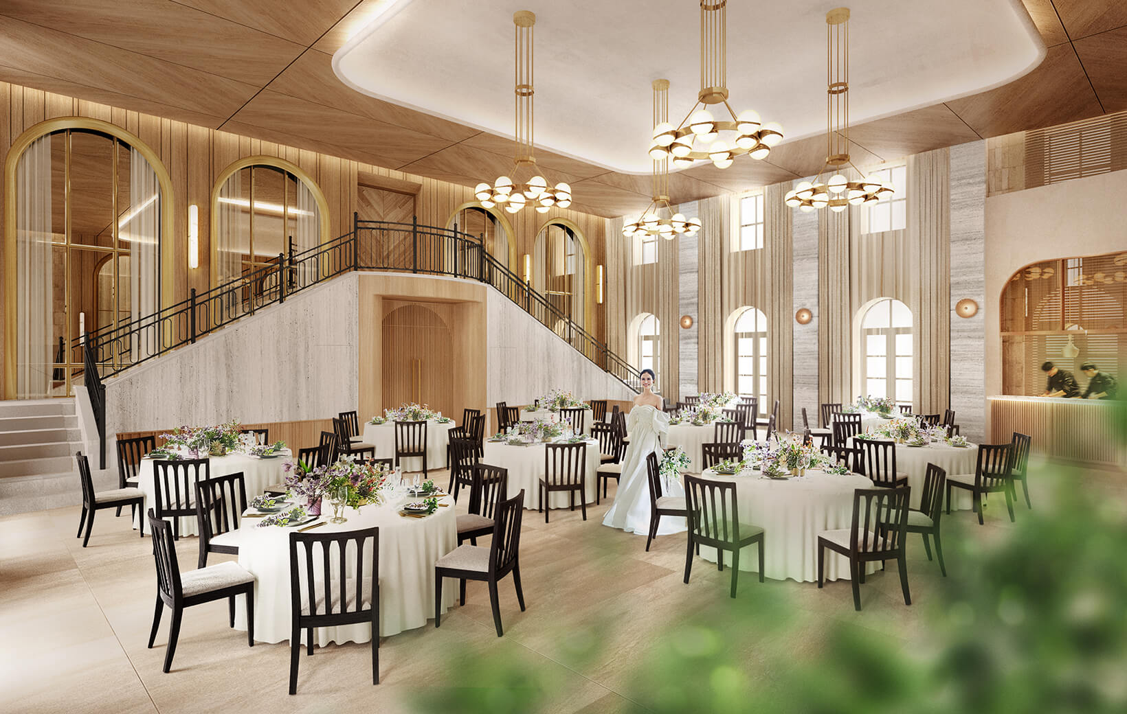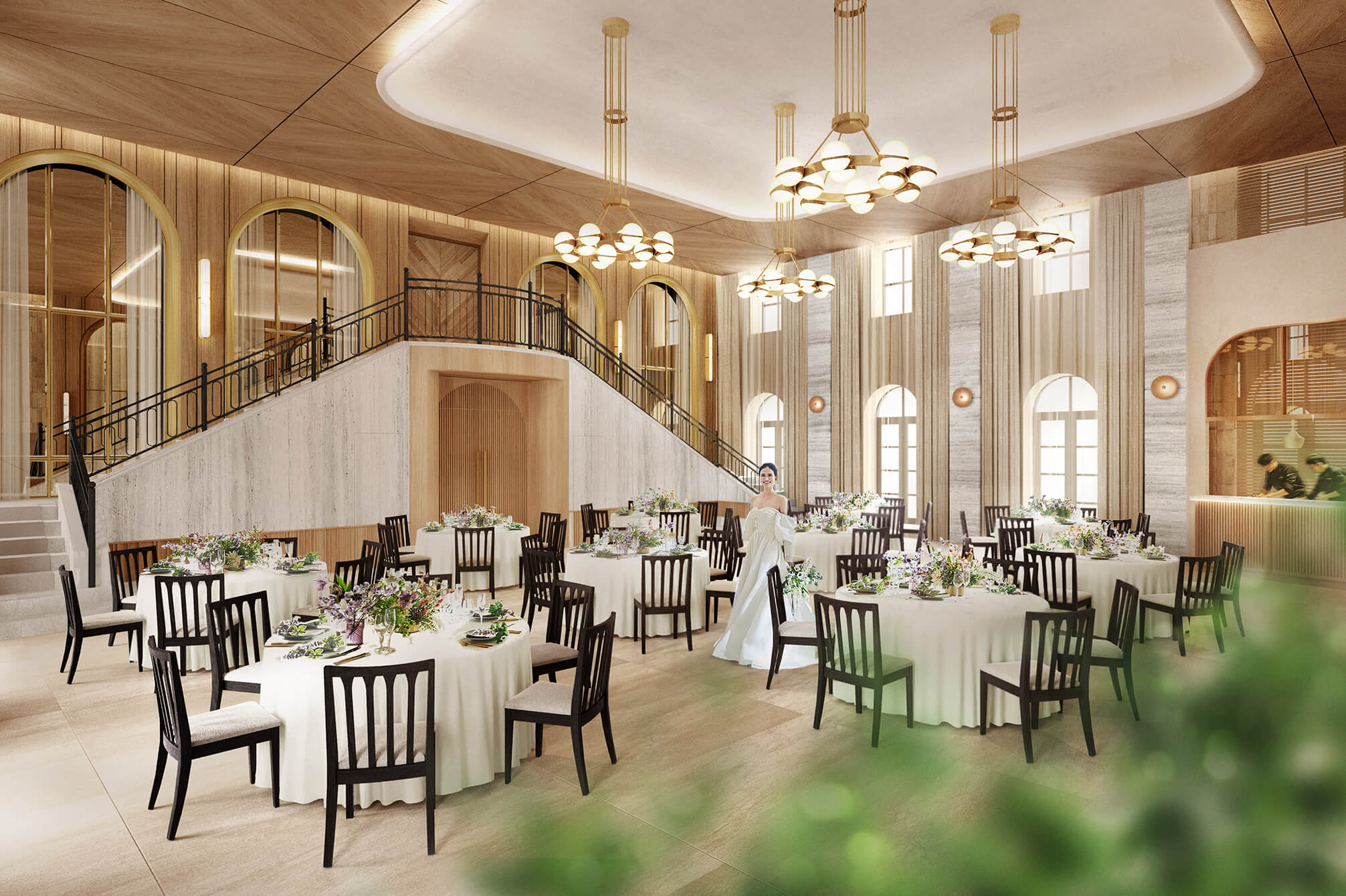 木の温もりと、ガラスが調和する洗練された披露宴会場。オープンキッチンが常設されており、貸切のシェフがゲストの心を満たす贅沢な一皿を提供いたします。ワントーンのシンプルな空間に、洗練されたインテリアが調和したパーティ会場を、おふたりらしいテーブルコーディネートで彩ります。