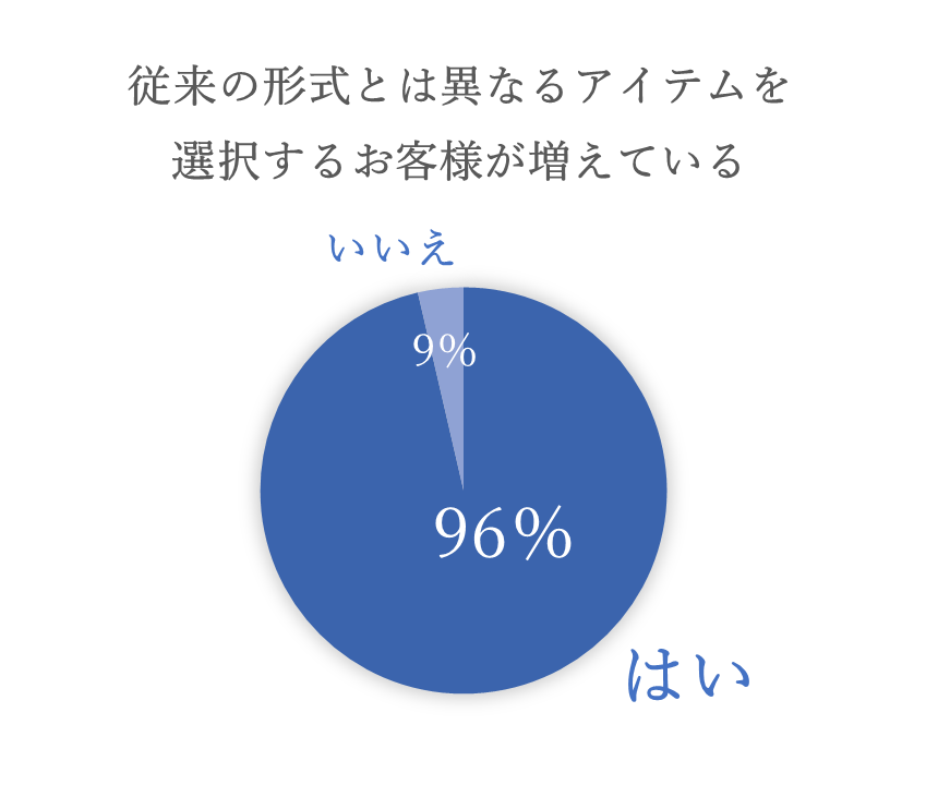 ゲストのためのアイテムにも新常識が誕生しています。ペーパーアイテムやギフトアイテムについて、「従来の形式とは異なるものを選択するお客様が増えている」と回答したウェディングプランナーは96%。実際に、SNSやメールで送れる“Web招待状”は発売時*¹に比べて2023年同時期には約7倍に増加、コンパクトな“カード式カタログギフト”は2019年*²に比べ、2023年同時期には2倍に増加。手軽に用意できる・持ち帰れる商品が人気です。