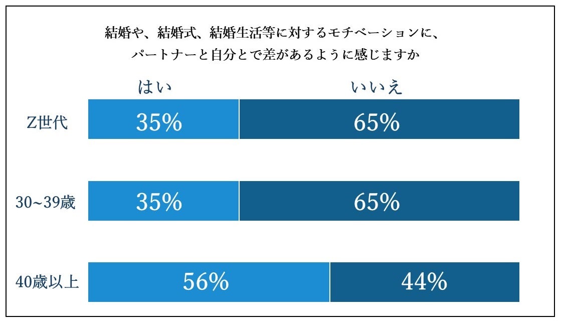 『結婚や結婚式等に対するモチベーション(式場の探し方や新居の決定方法など、結婚生活のすべてを含む)に、パートナーと自分とで差があるように感じますか』という質問に、Z世代の方の65%が「いいえ」と回答し、30~39歳の方についても同様の結果でした。一方、40歳以上の方は56%が「はい」と回答し、30代以下の方と比べてモチベーションに差があると感じている比率が高いことが分かります。