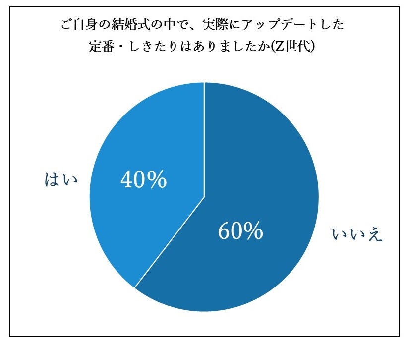 『結婚式の中で、実際にアップデートした定番・しきたりはありましたか』という質問に対して「はい」と答えたZ世代の方は40%、30歳以上の35%よりもやや多い結果になりました。Z世代の方が時代や価値観に合わせて結婚式をアップデートしていることが伺えます。実際に、Z世代の方がアップデートした内容については「進行や演出について」が最も多い結果となりました。