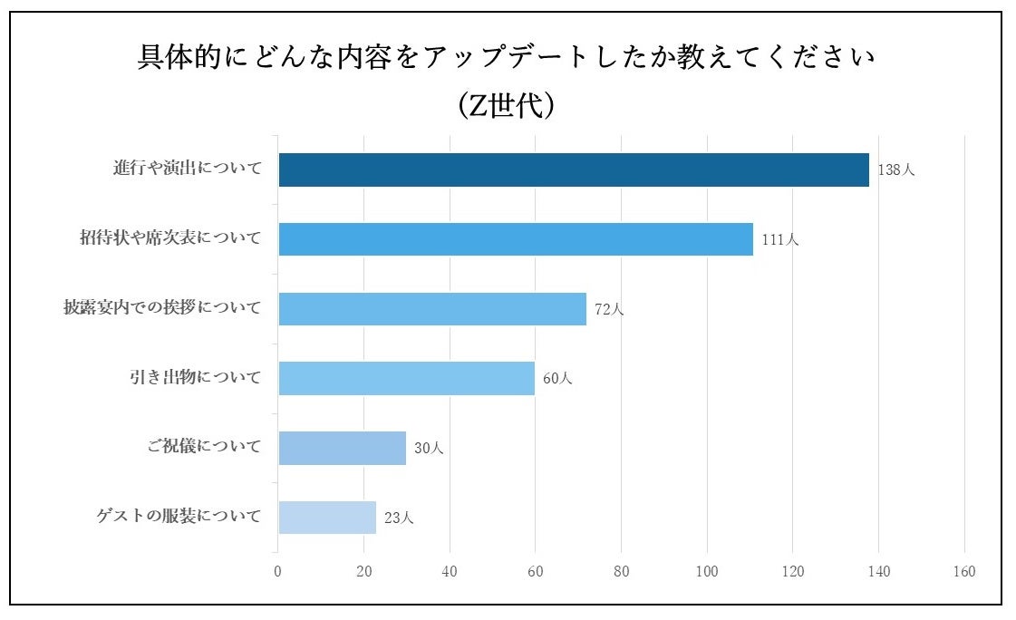 『結婚式を行うにあたって、アップデートしたいと感じた結婚式の定番・しきたりは?』という質問に、Z世代の方は「進行や演出について(133人)」「招待状や席次表について (111人)」の順で回答が集まりました。