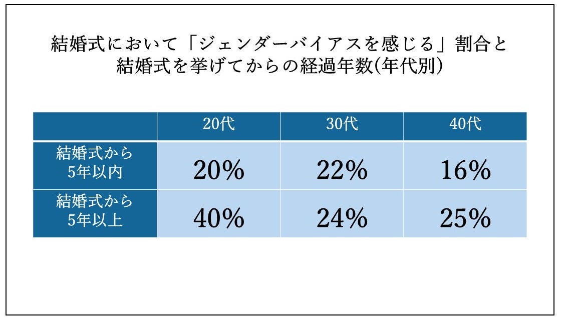 また、結婚式においてジェンダーバイアスを感じる割合と結婚式を挙げてからの経過年数を調査すると、どの年代でも直近5年以内での結婚式の方がよりジェンダーバイアスを感じる機会が少ないことがわかりました。20代のジェンダーバイアスを感じる割合に着目すると、結婚式から5年以内が20%、結婚式から5年以上が40%と大きな違いが見られます。世代による価値観の変化と、直近5年間で結婚式のアップデートが進んでいることが読み取れます。