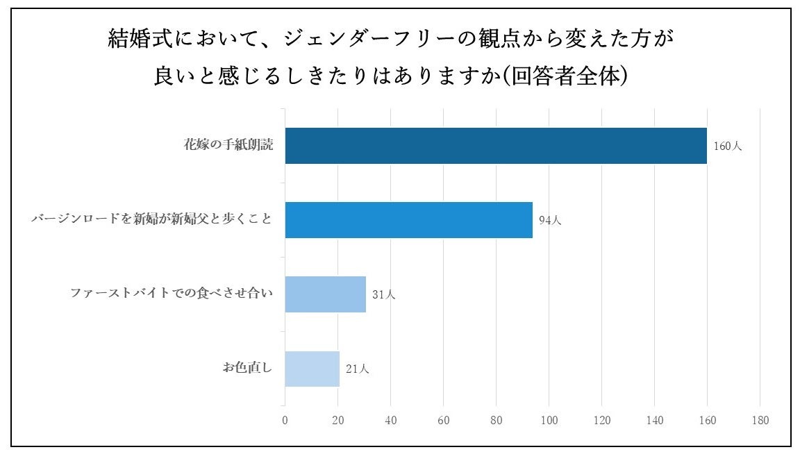 具体的にジェンダーバイアスを感じた内容として、「花嫁の手紙朗読」「バージンロードを父親と歩くこと」「ファーストバイトでの食べさせ合い」「お色直し」の順で回答が集まりました。また、ジェンダーフリーの観点から「バージンロード」や「新郎新婦」「花嫁」といった、結婚式で当たり前のように使われる言葉に対して違和感を持つという回答も多く、「結婚式では男性の名前を先に記載することが多いが、それもカップルの自由で良いと感じる」といったコメントもありました。