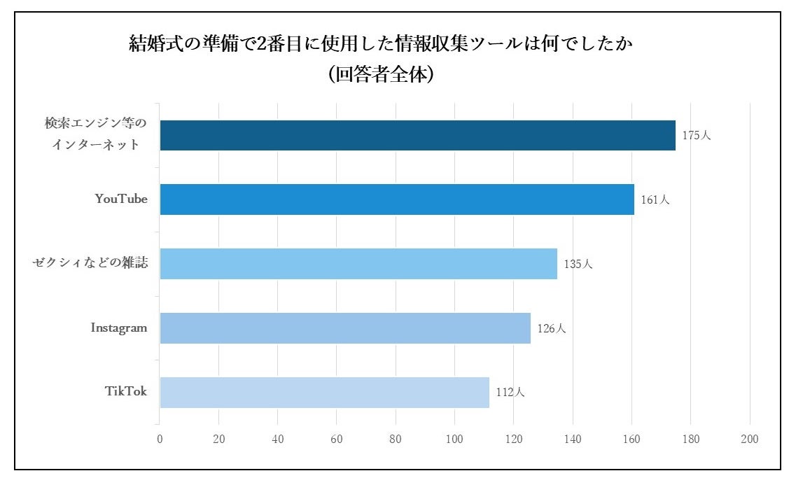 『結婚式の準備で最も多く使用した情報収集ツールは何でしたか』という質問については、「Instagram(531人)」が最も多く、2番目に多い「ゼクシィ等の雑誌(100人)」と大きな差が見られ、Instagramを活用した方からは「先輩花嫁アカウントの投稿や写真を参考にしている」というコメントが多く寄せられました。『結婚式の準備で2番目に多く使用した情報収集ツールは何でしたか』という質問には、「検索エンジン等のイン ターネット(175人)」という回答が最多に。Z世代の方の回答には「TikTok」や「YouTube」といったSNS ツールを用いたという回答が多く、「ChatGPT」を式場選びに活用したという方も。一方で30代以上の方は「友人」や「ウェディングプランナー」といった身近な人から情報収集をする傾向が見られ、情報収集ツールも変化していることがわかりました。