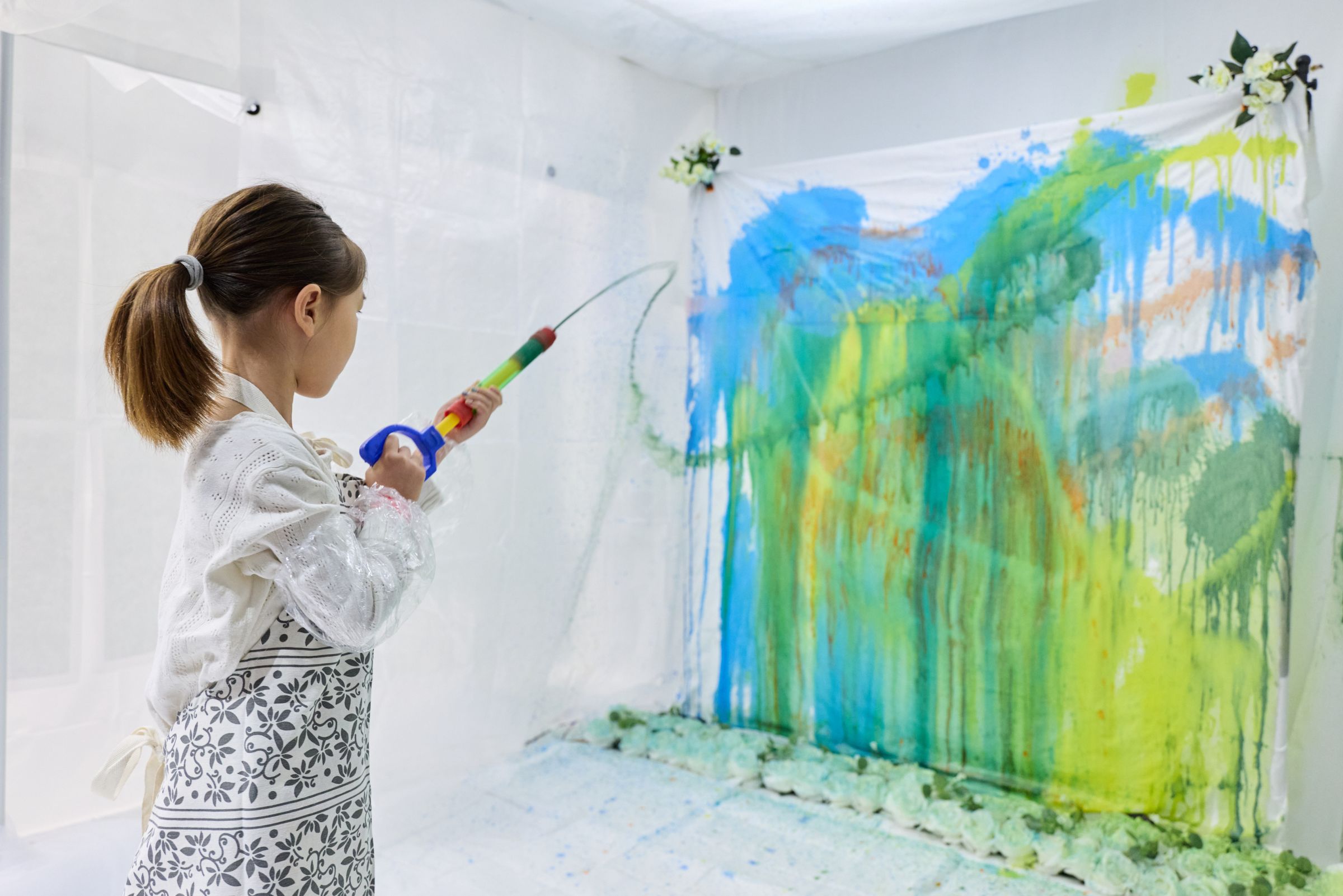第三回は廃コスメ絵具を使った水鉄砲アート体験。一枚の布に参加者一人ひとりがペイントし、一つのアート作品を作り上げることで、自由に表現する楽しさや、多様性・共創の価値を体感する機会を提供しました。