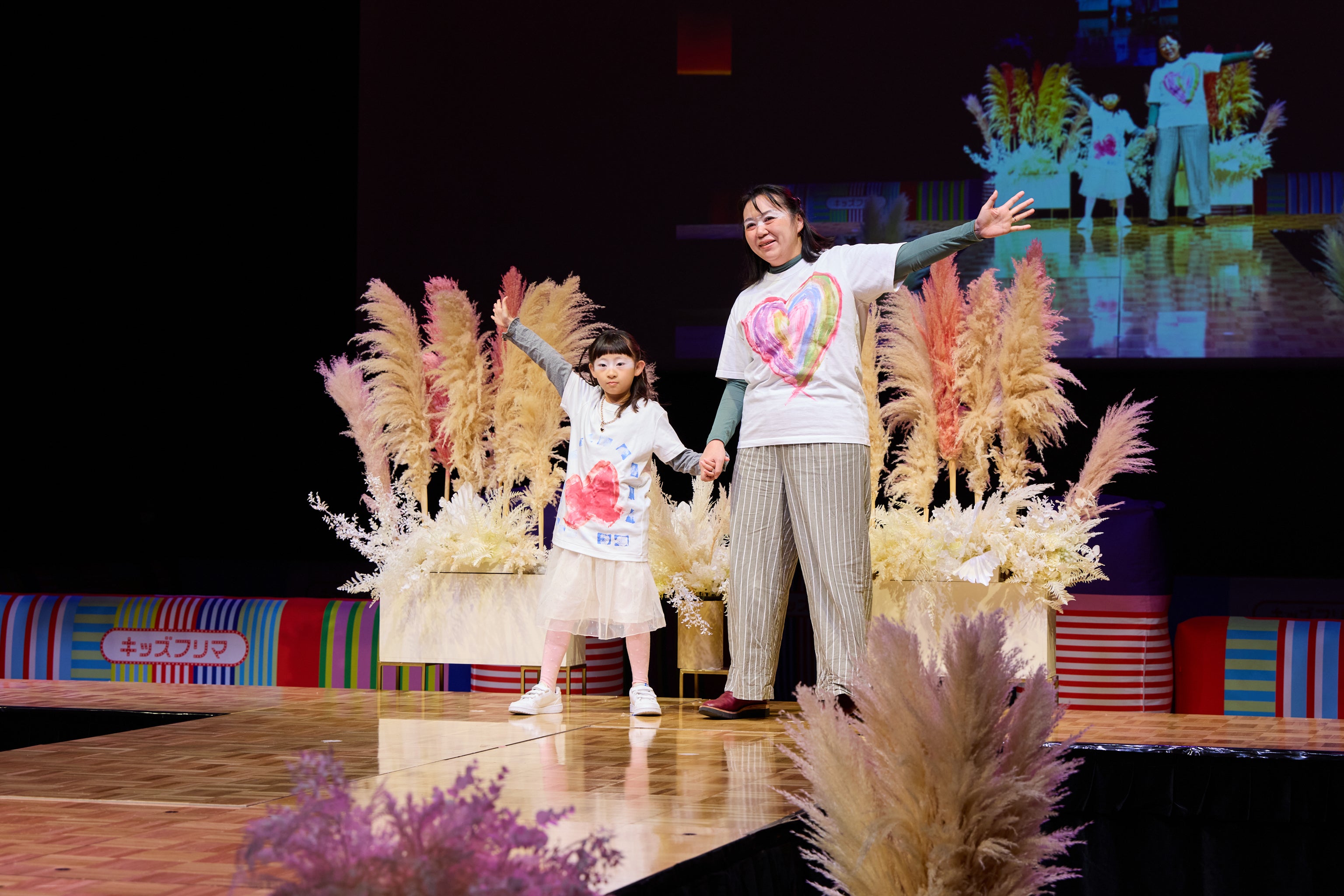 会場のメインステージでは共立女子大学家政学部被服学科 宮武研究室と連携して作り上げたアップサイクルファッションショーを実施。宮武教授企画・デザインのアップサイクルドレスを披露するショーに加えて、9月の「エシカルカフェ」に参加した5組の親子も廃コスメ由来の絵の具でデザインした洋服を纏って登場するなど、ショーを通じて廃棄されるものに新たな価値を創造するアップサイクルファッションの楽しさを伝えました。