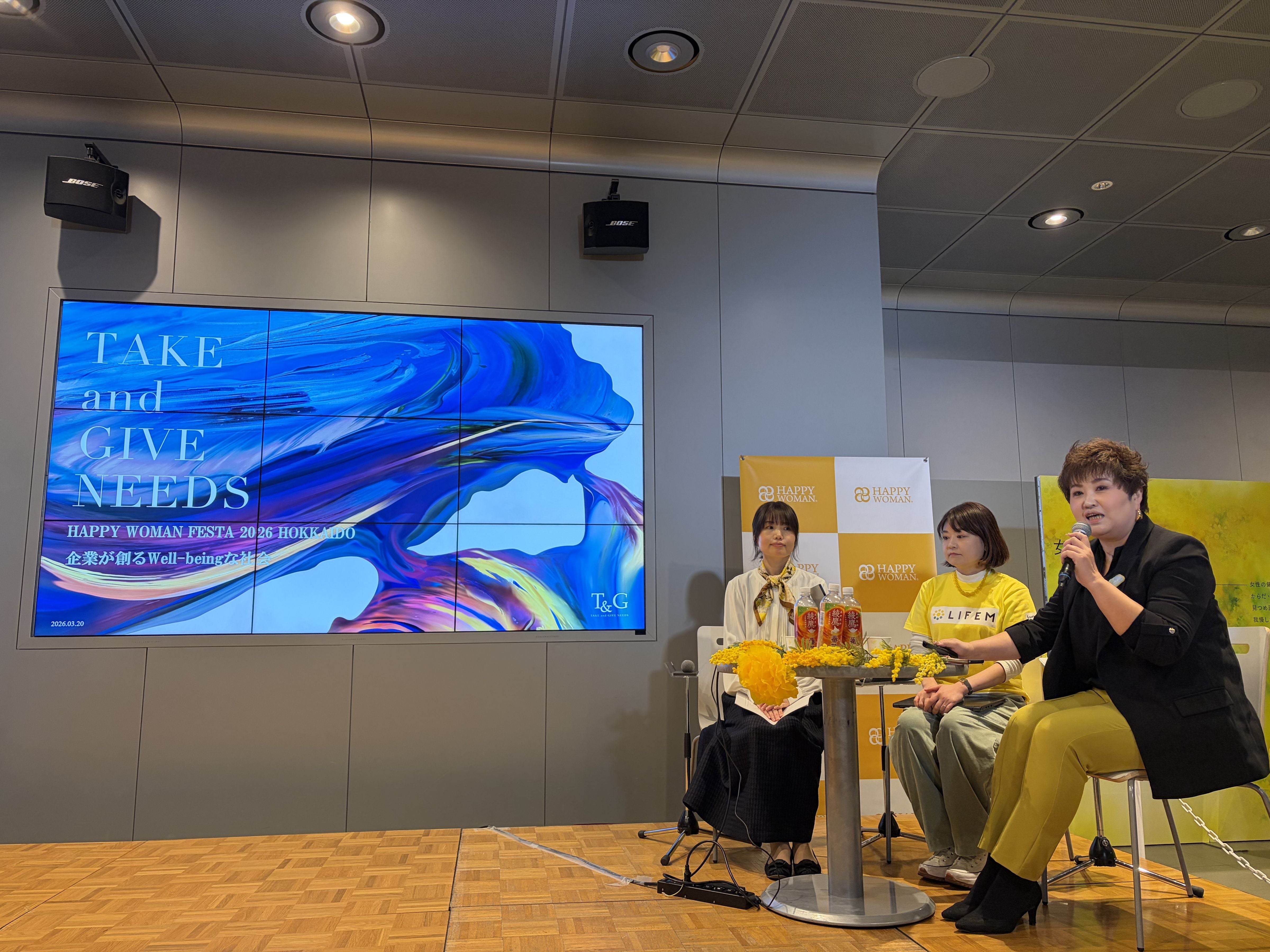 さらに、取材報告会で交流が生まれた北海道コカ・コーラボトリング株式会社の紹介で、「すべての女性が自分らしく幸せに生きられる未来を共創する」ことを目指す一般社団法人HAPPY WOMANと出会いました。国際女性デー啓発に積極的に関わっているという共通点があることから、札幌市で開催された国際女性デーイベント「HAPPY WOMAN FESTA 2026北海道」に招待いただき、当社サステナビリティ推進室室長の金井が登壇。女性が健康で自分らしく働くための支援制度として導入している「Femself-box」などについて説明しました。