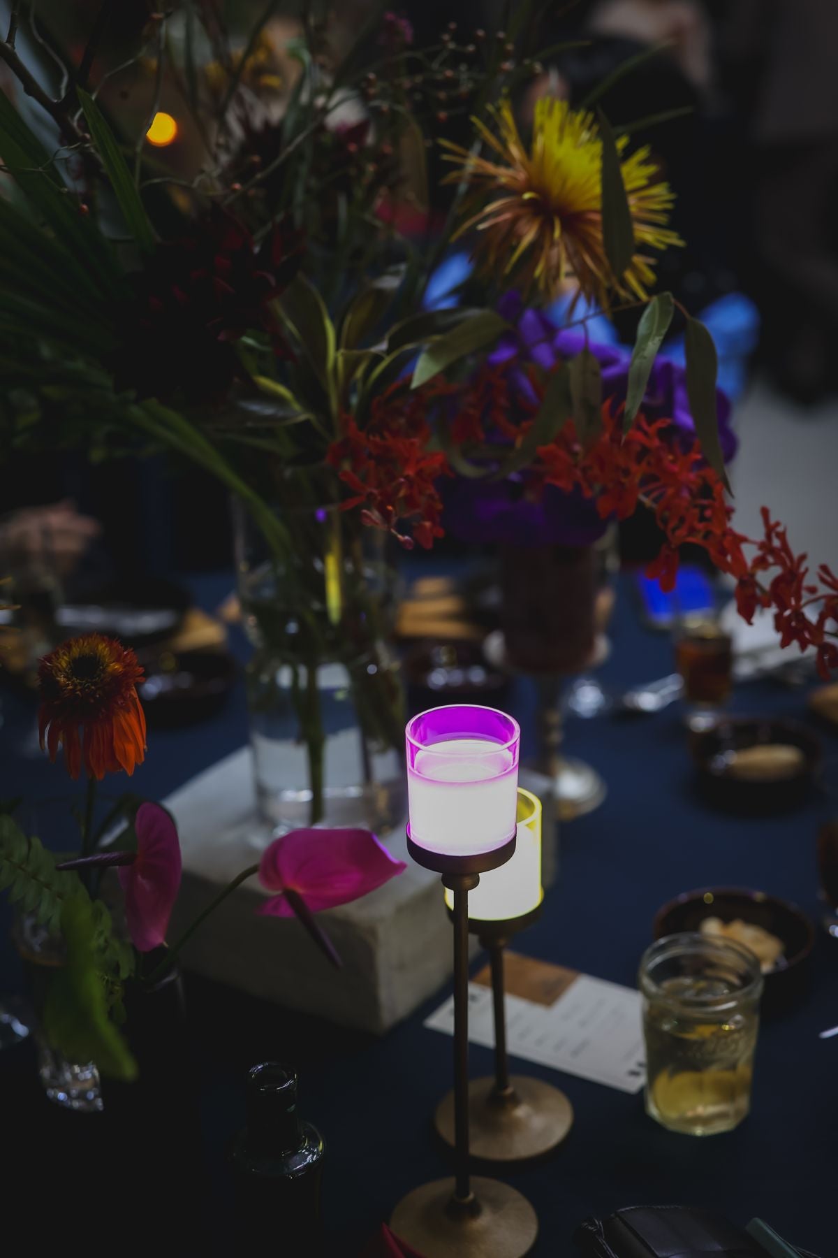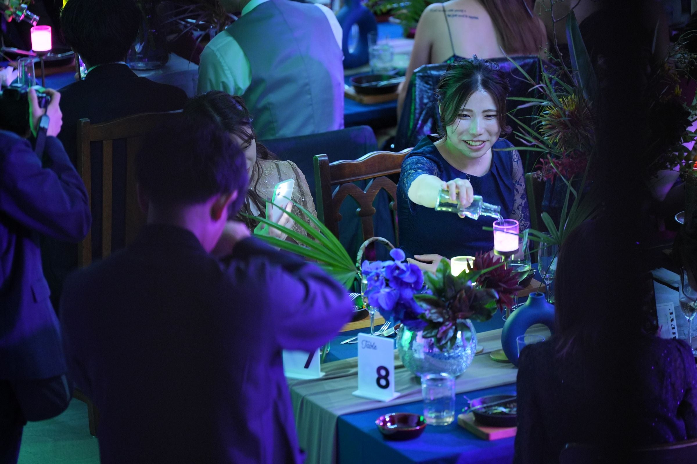 おふたりのお色直し入場前、ゲストの皆様にネオンリキッドの演出をしていただき、