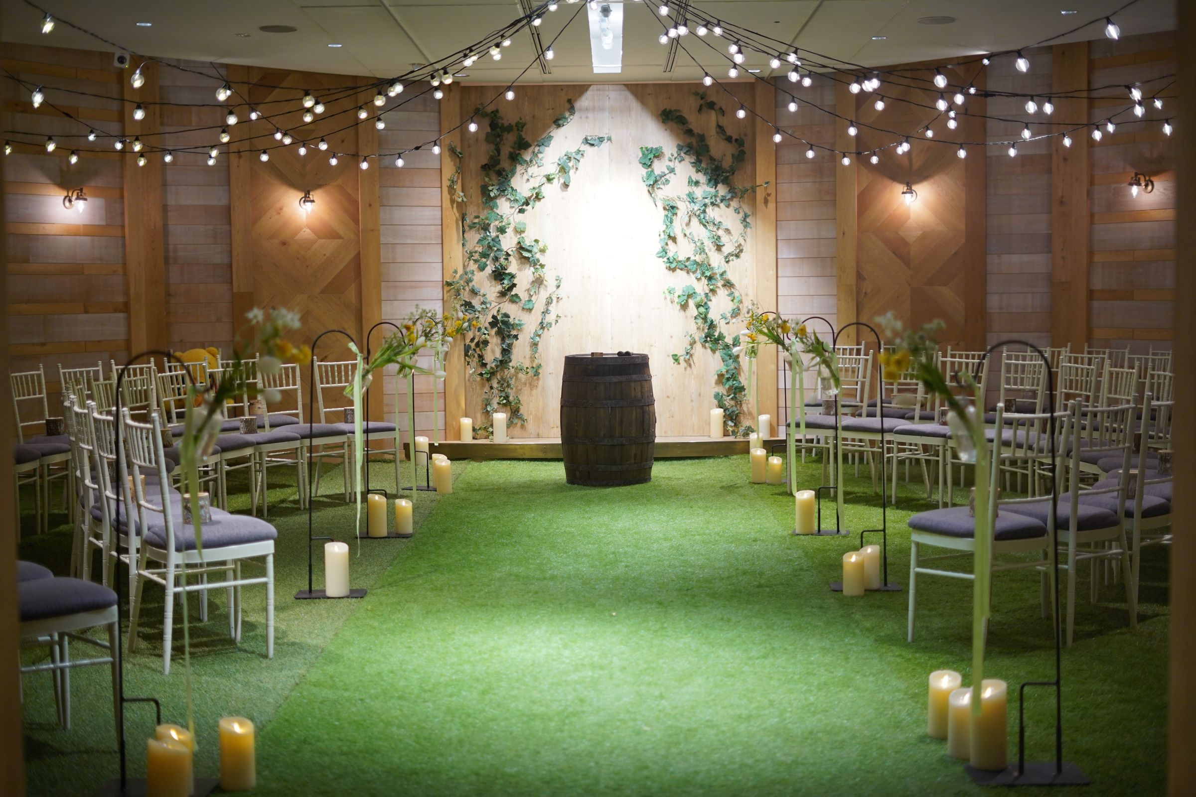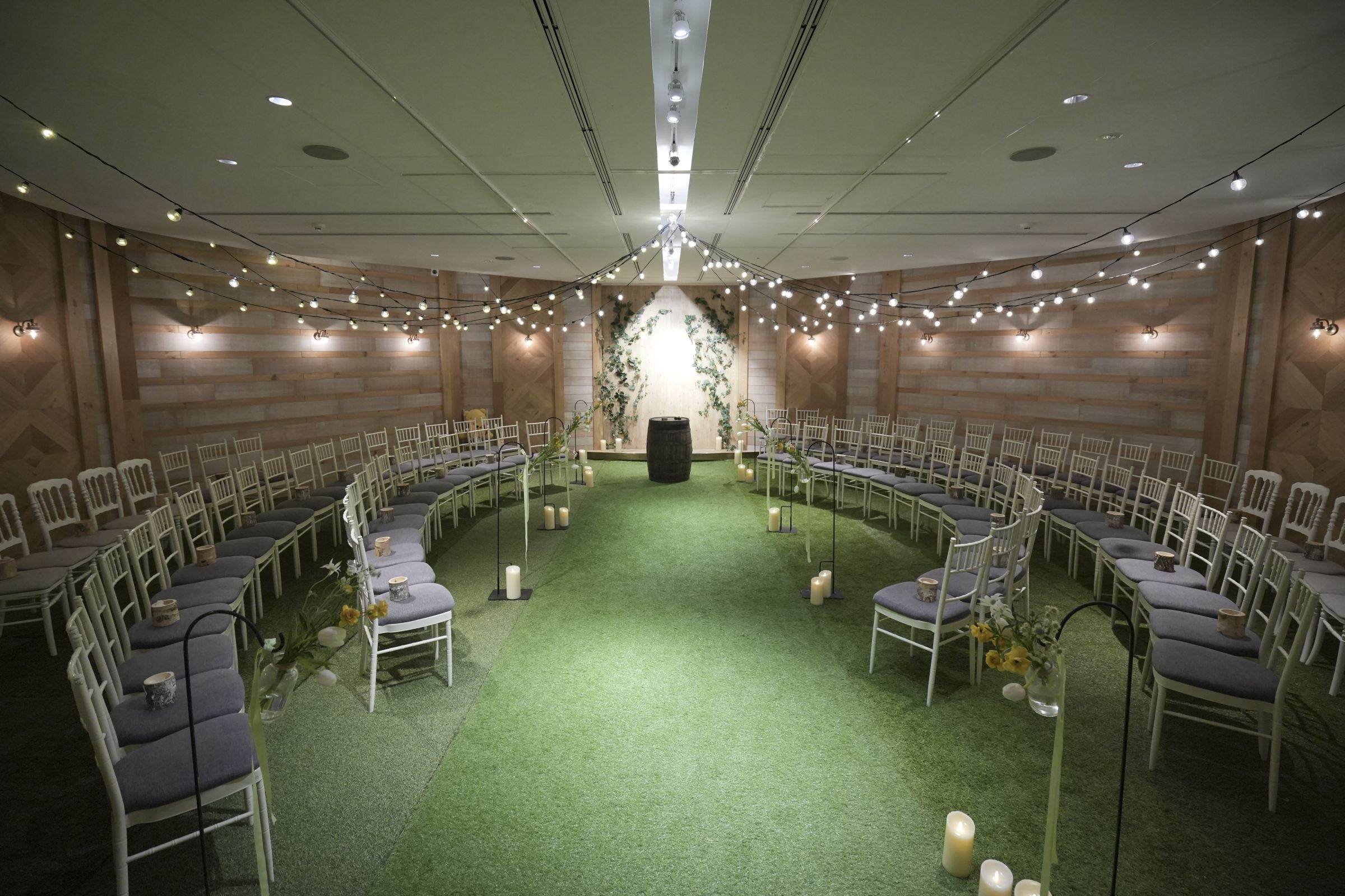 挙式会場の装飾はリラックスして過ごしいただけるように芝生の絨毯を