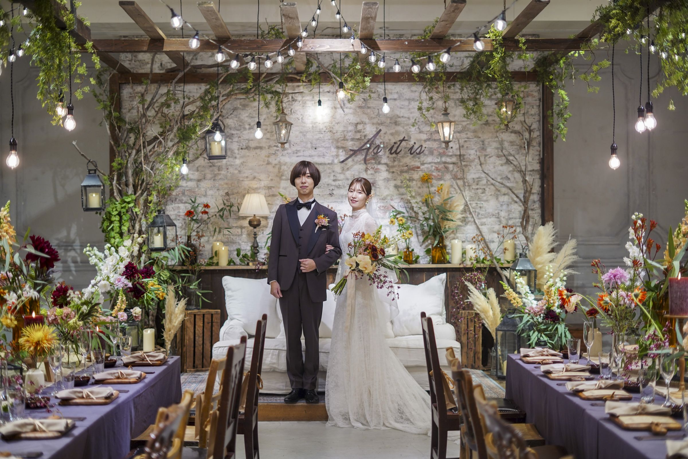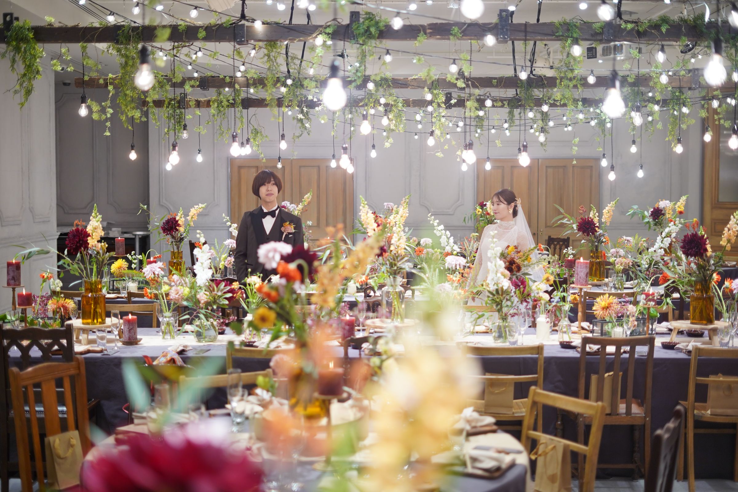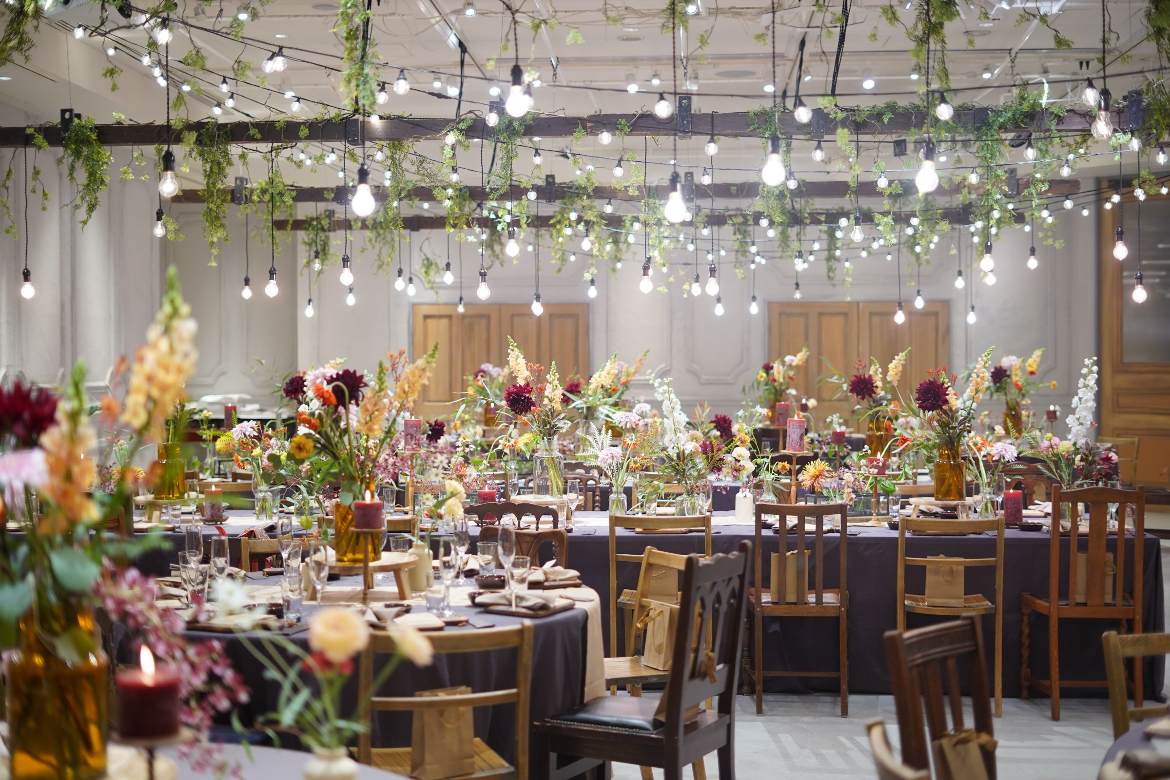 パーティ会場はナチュラルなお花をベースに、温かみのあるライティングで装飾。