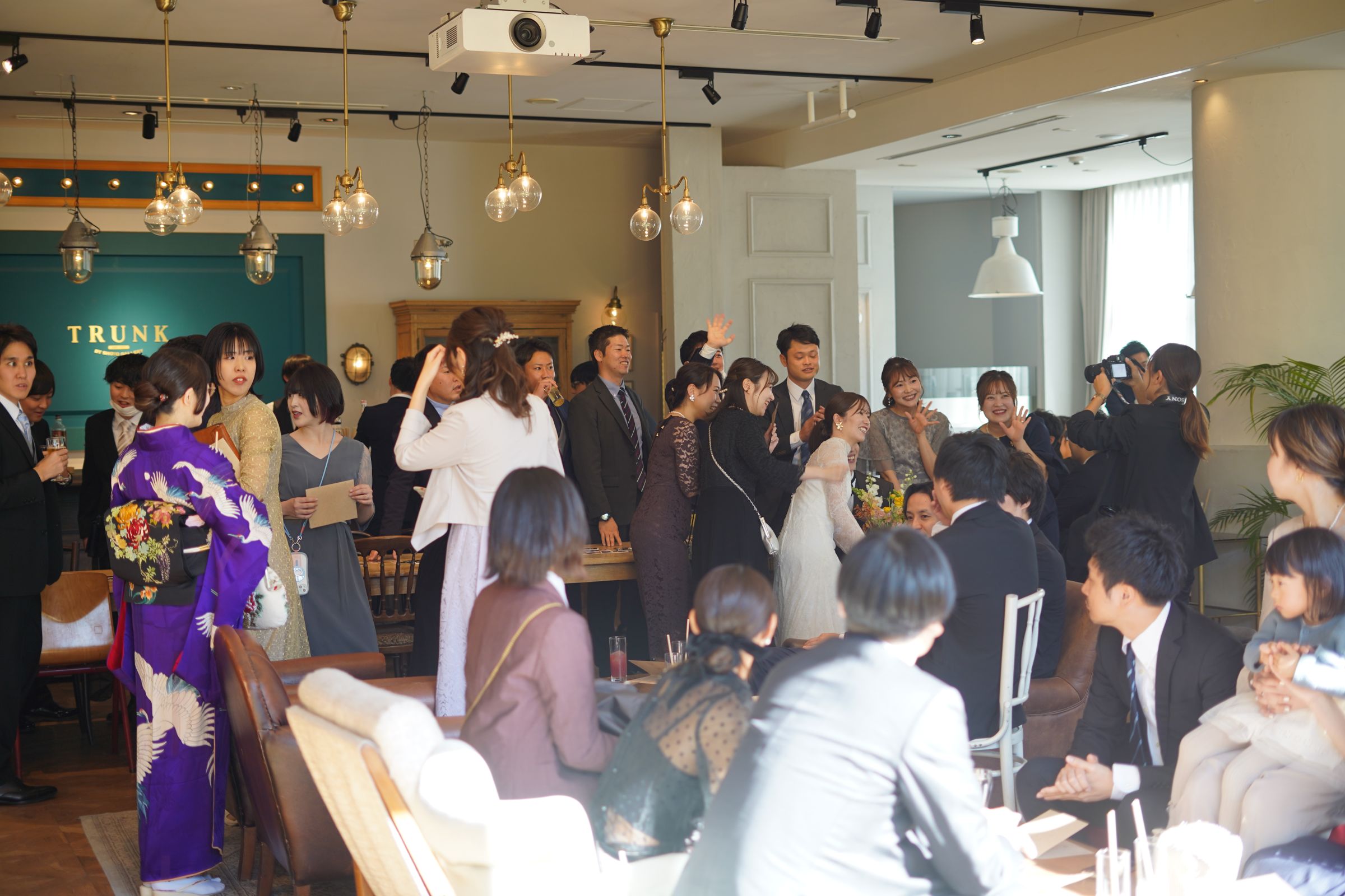 ウェルカムパーティで緊張もほぐれたおふたりとゲストの皆様、距離感が近く笑顔溢れる温かい時間になりました!