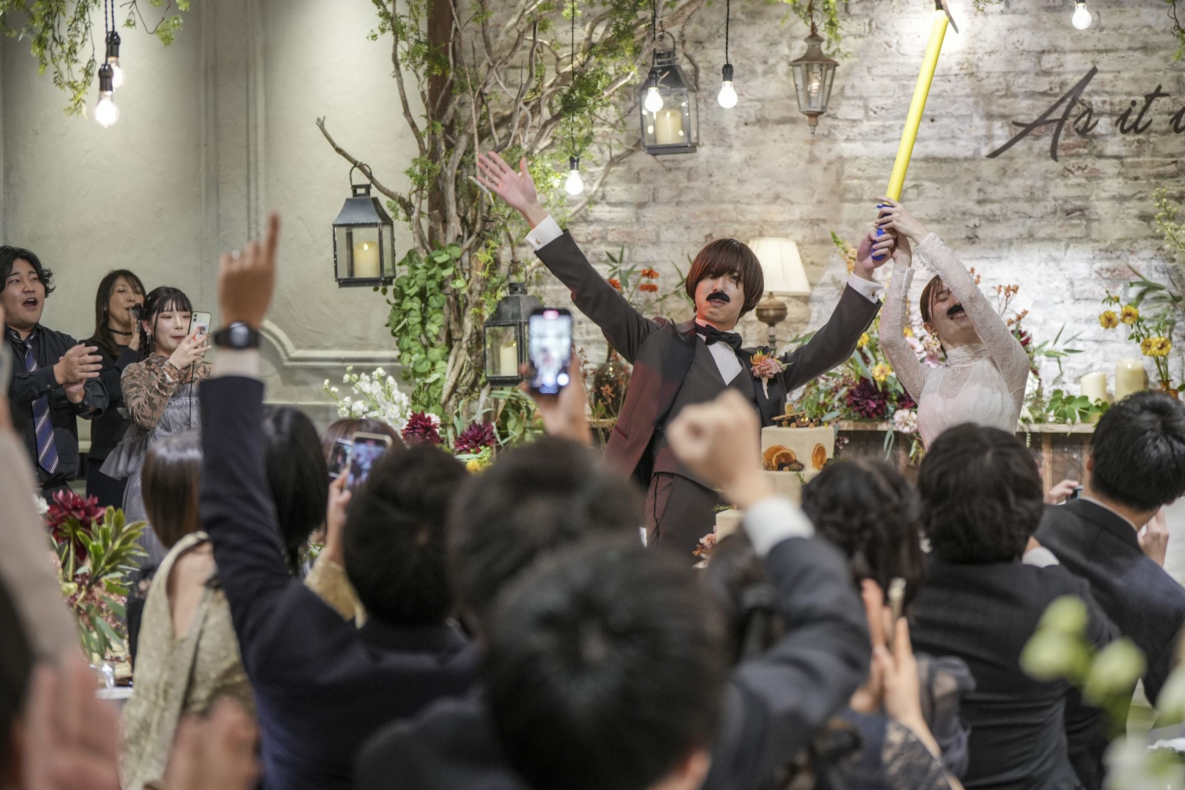 披露宴では、ゲストの方に楽しんで欲しいという思いからおふたりが”髭ダンス”をご披露!