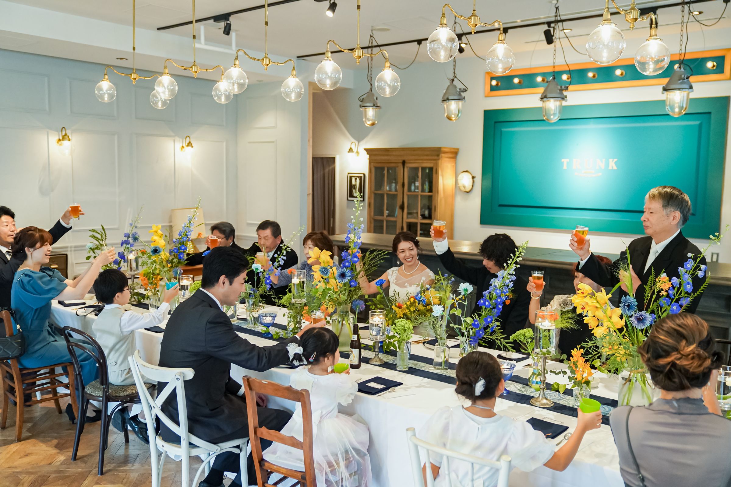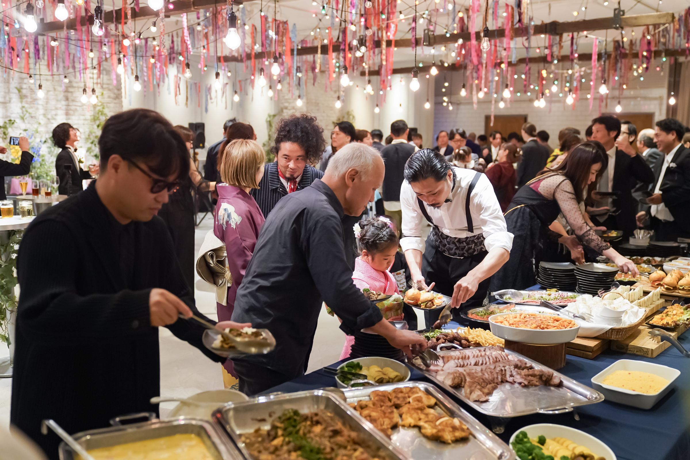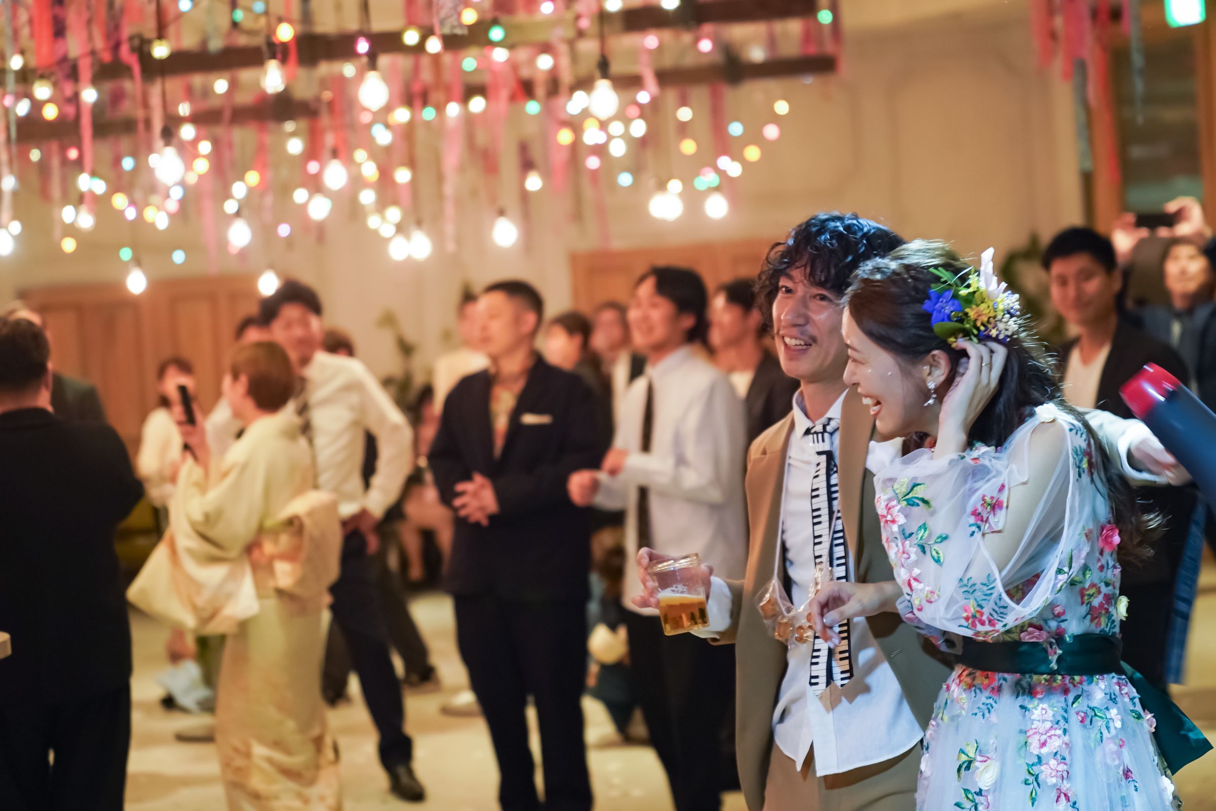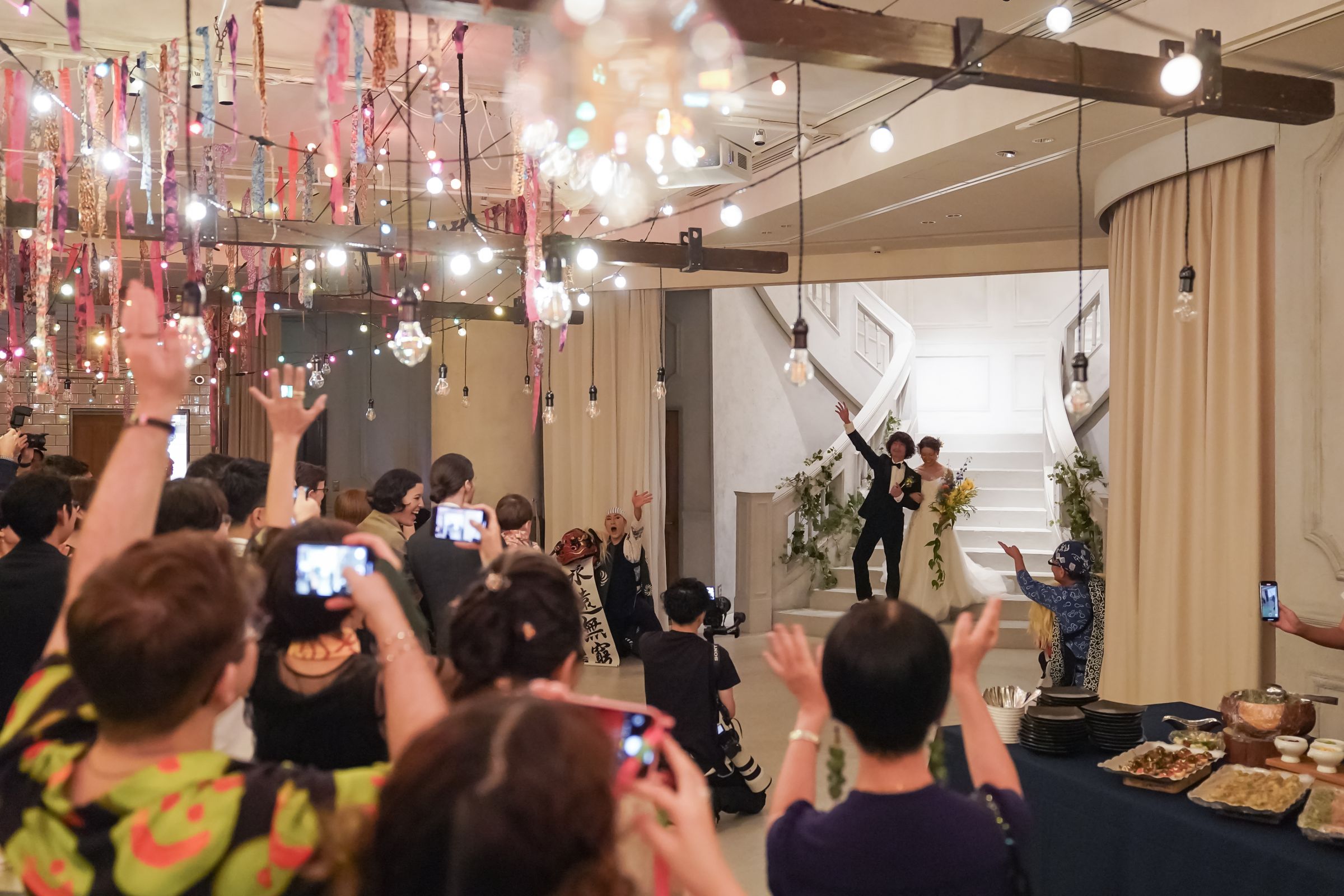 のびのび踊れるようにフロアを広く使った 立食パーティのスタイルに