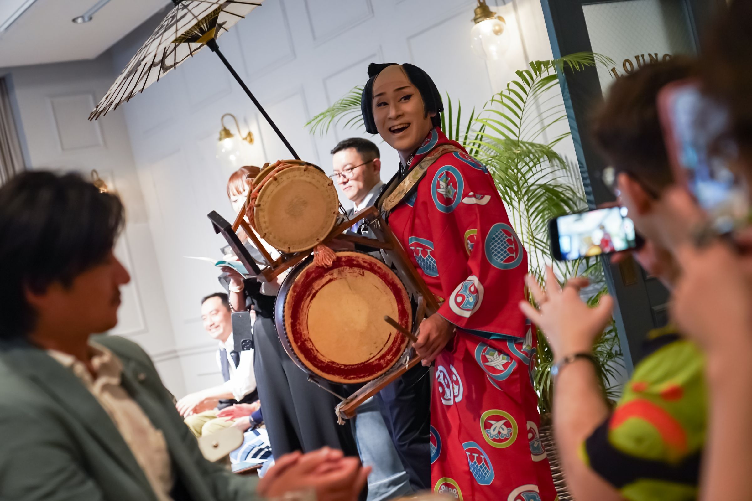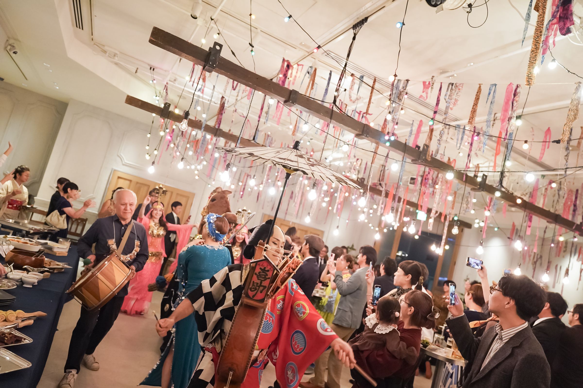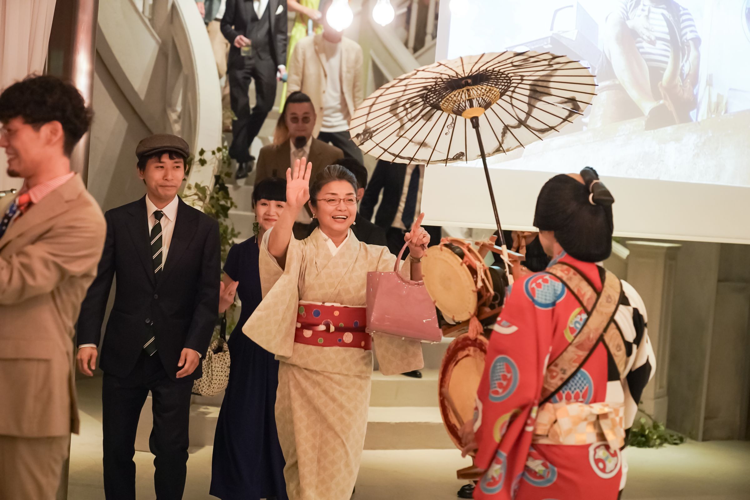 ゲストと一緒に大名行列を組んで1Fのパーティ会場へと向かいます