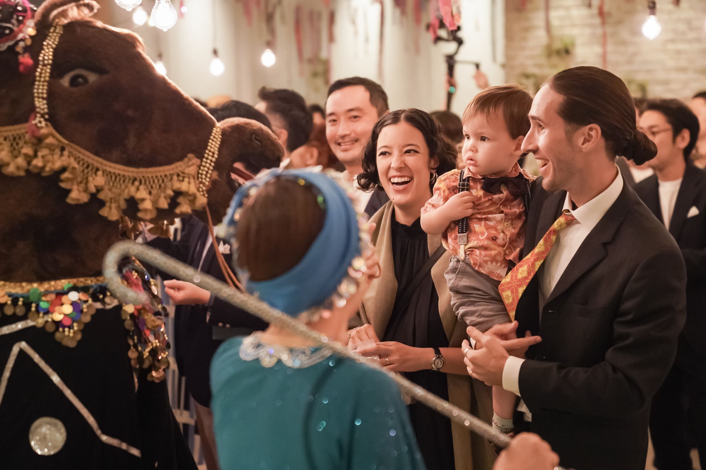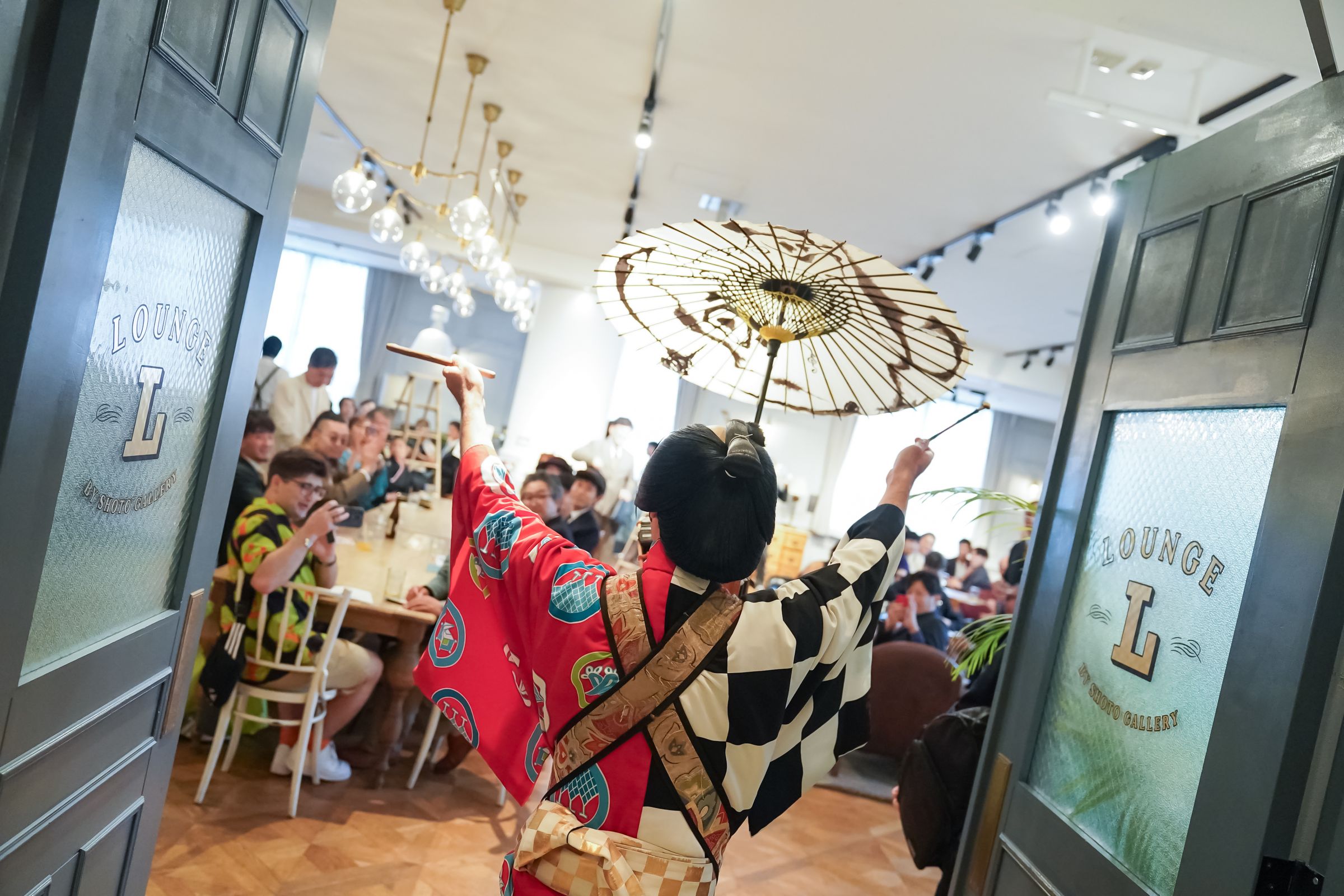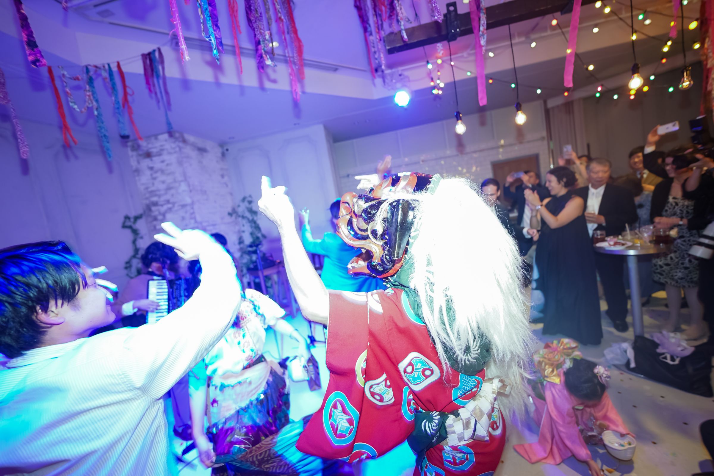 ゲストと一緒に大名行列を組んで1Fのパーティ会場へと向かいます