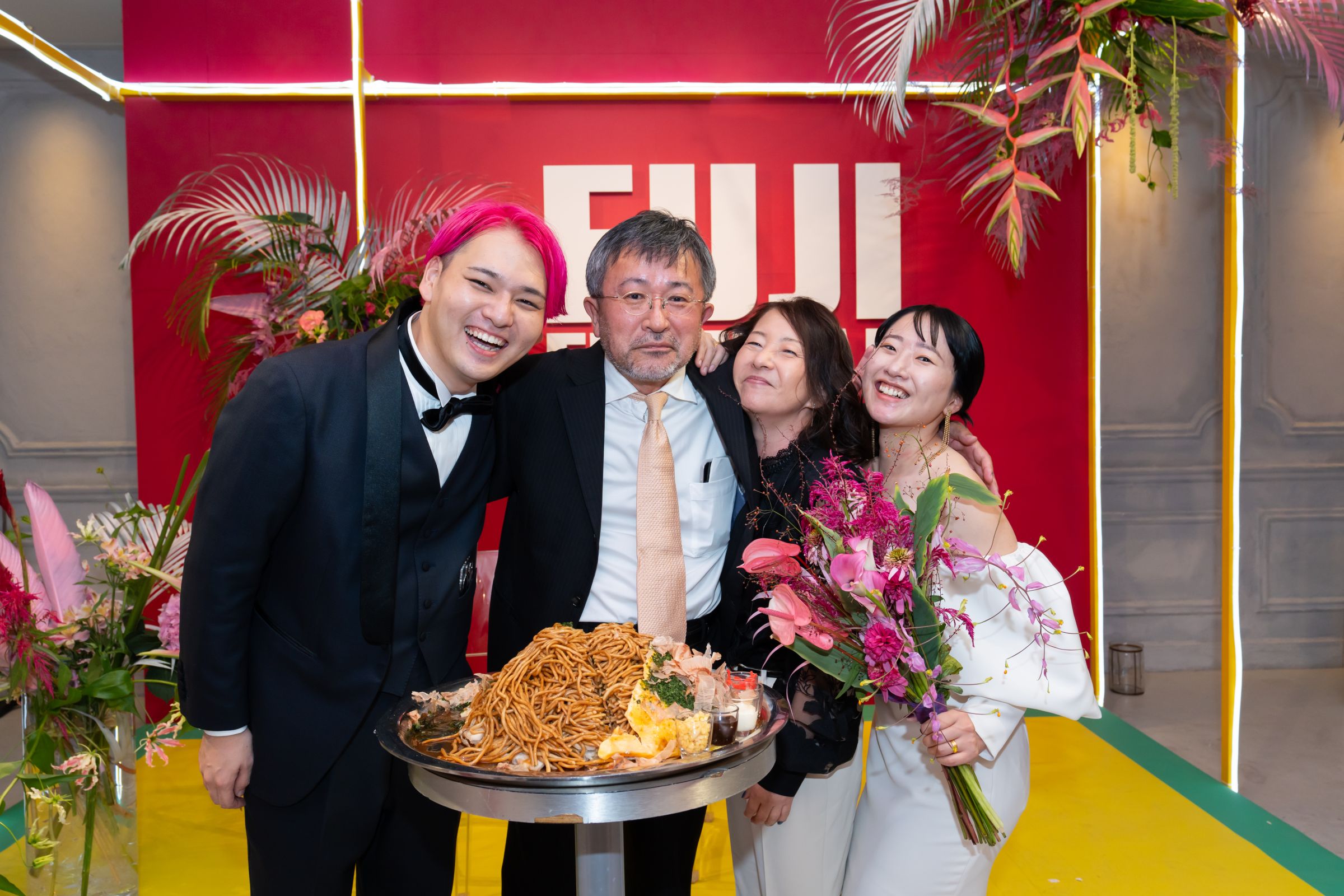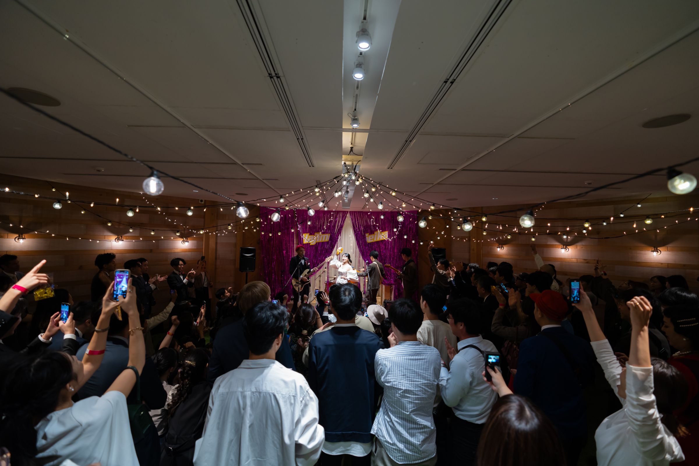 ゲストが待つ会場に、ふたりがまるでアーティストのようにステージの幕の中から登場する演出で大盛り上がり。