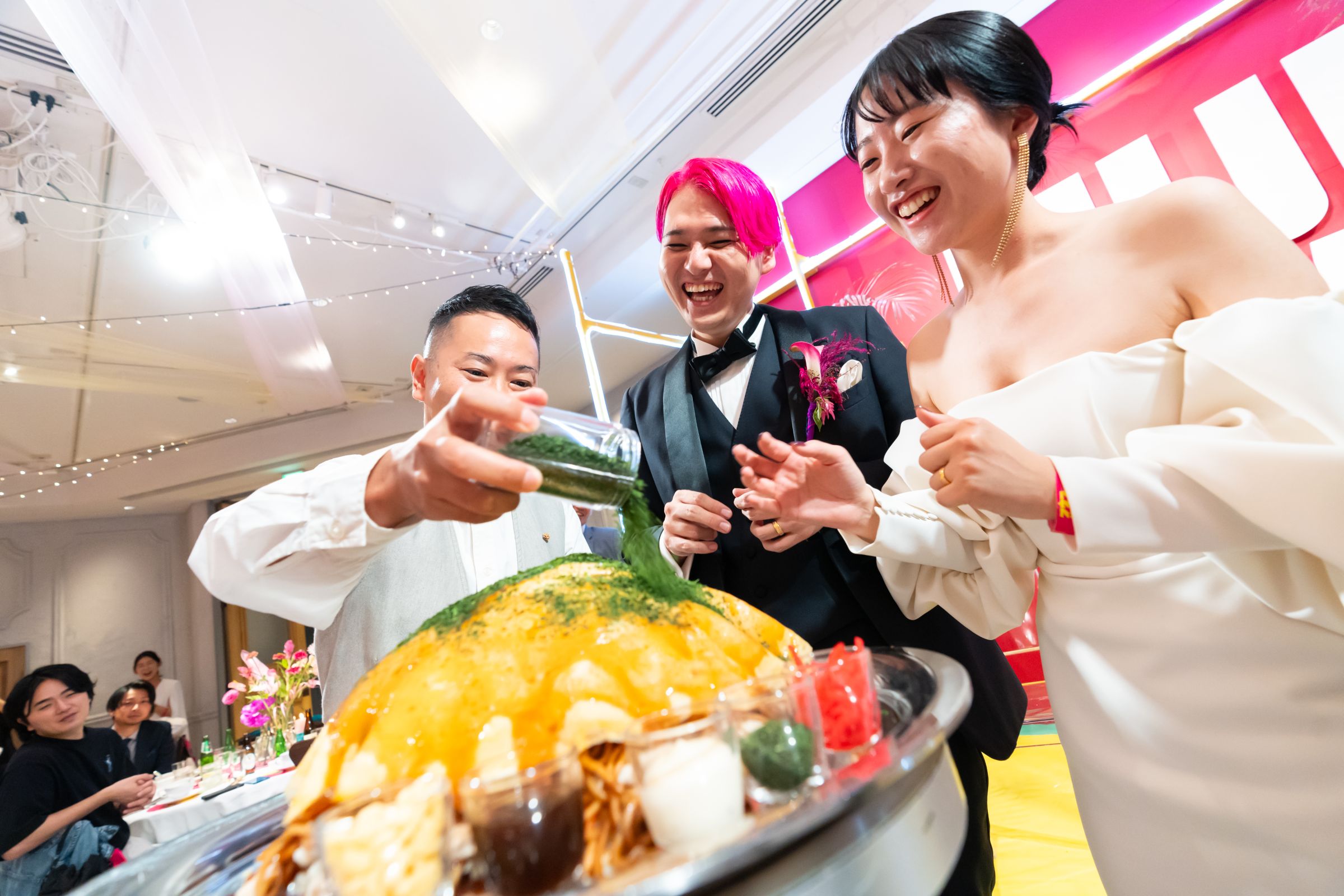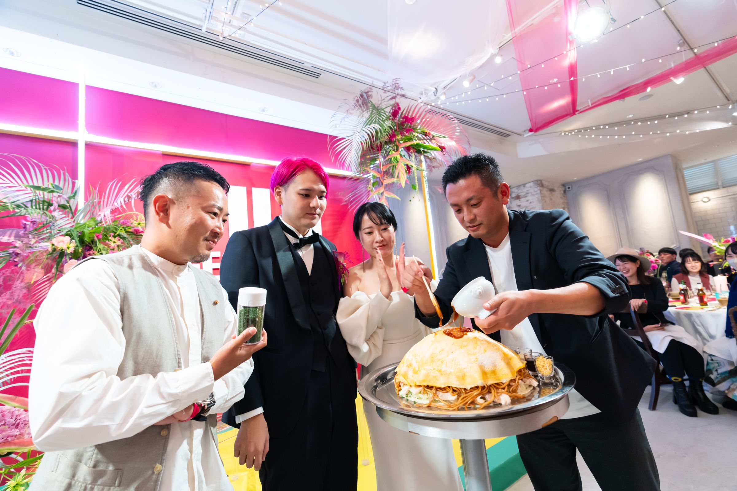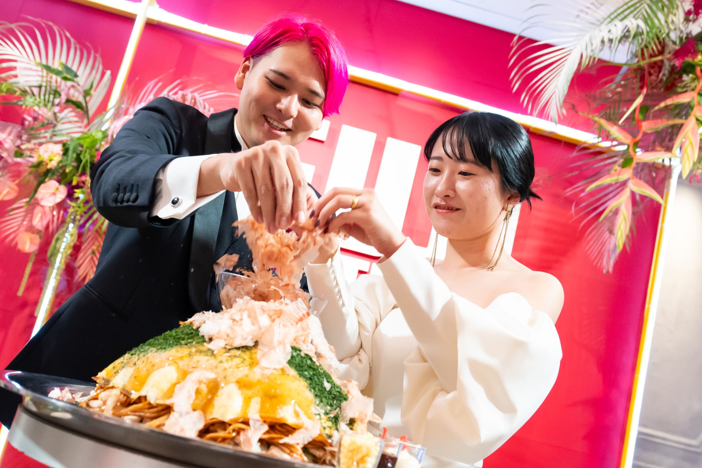 おふたりの地元にちなんだ、お好み焼きを完成させるセレモニー。