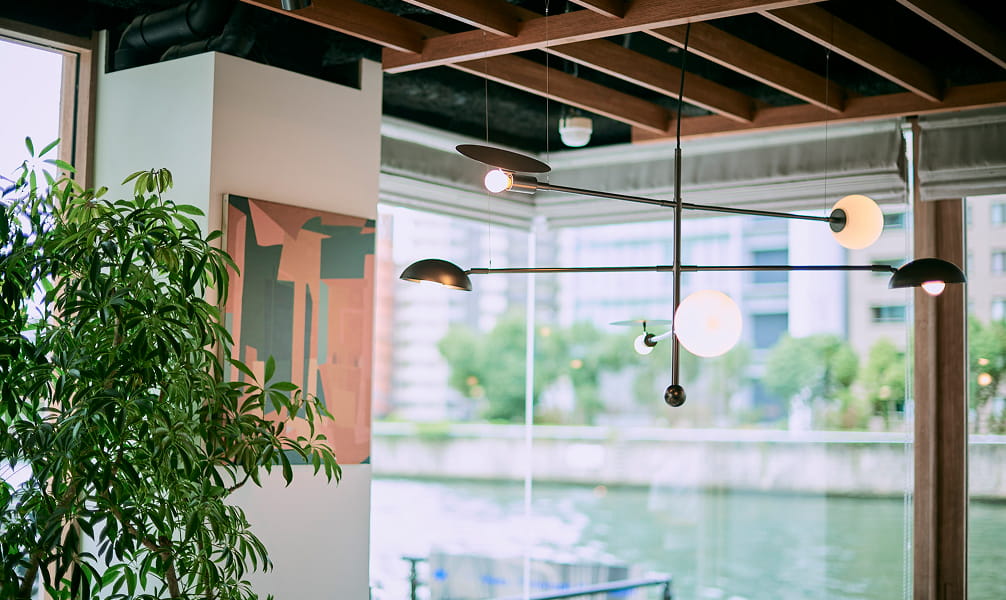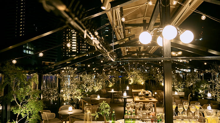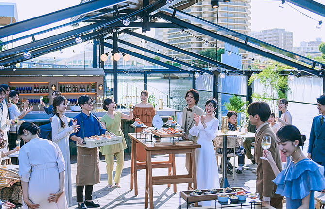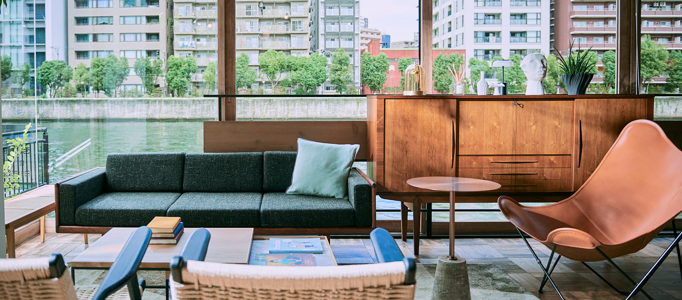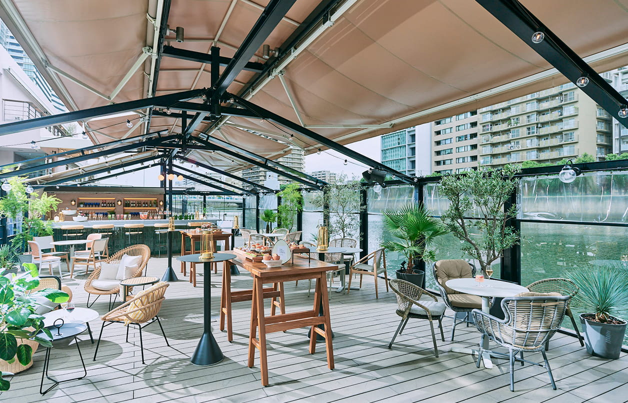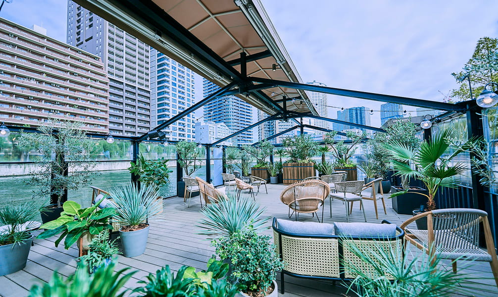 堂島川に浮かぶ都会の喧騒を忘れさせる水と緑に囲まれたテラス。