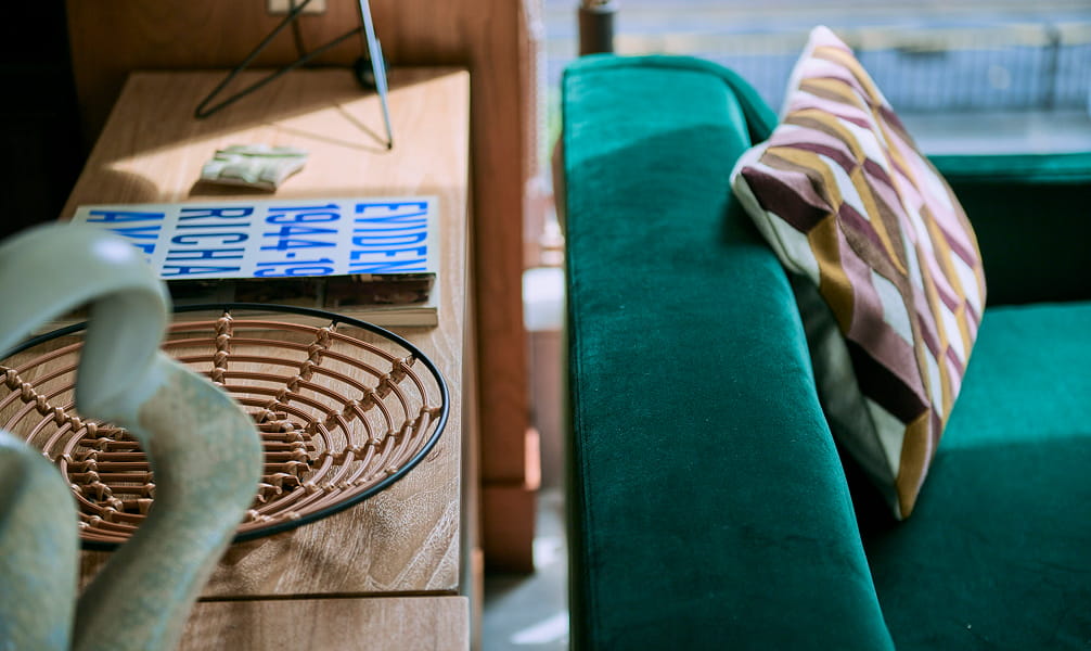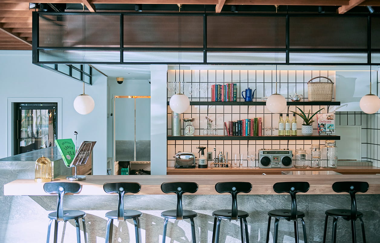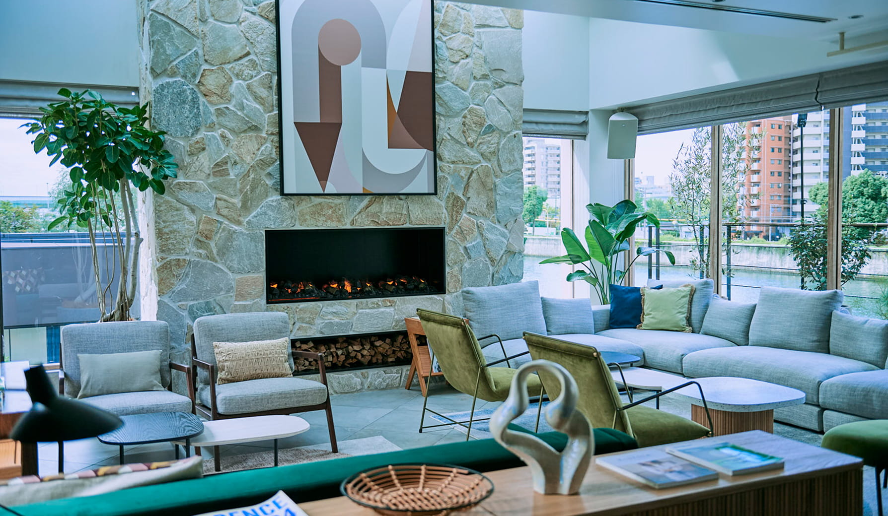 1Fのリビングルームはカフェのようなセンスの良い家具が散りばめられたお洒落でありつつ、カラオケやレコードを楽しめるなど遊び心が詰まった空間です。カラオケのモニターではビンゴゲームも可能です。